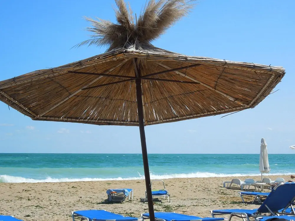 Частный пляж с шезлонгами и зонтиками, кафе-мороженое на пляже