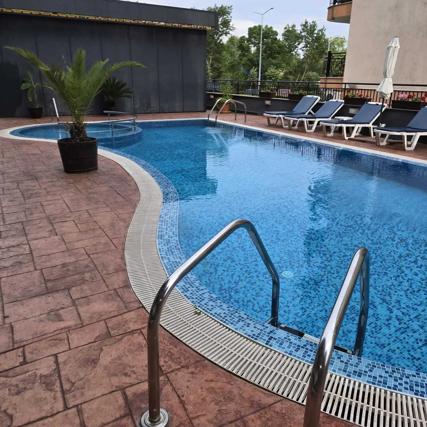 Бар у бассейна и зона отдыха с шезлонгами и зонтами