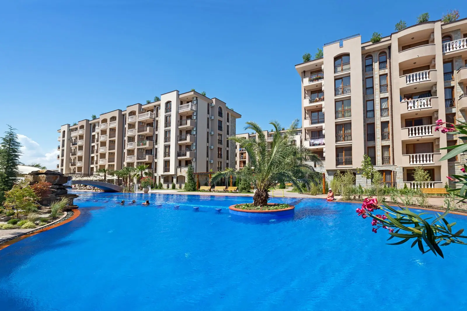 Комплекс отличается продуманной архитектурой, обилием зелени и современными решениями в сфере комфорта. Уютные аллеи для прогулок, фонтанчики, декоративные мостики, зоны отдыха и множество развлечений создают атмосферу уединённого и безопасного пространства, где всё под рукой и ничего не отвлекает от удовольствия жить у моря.