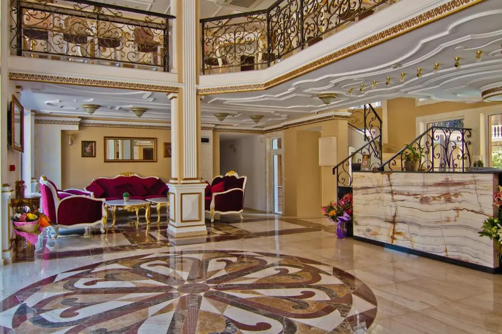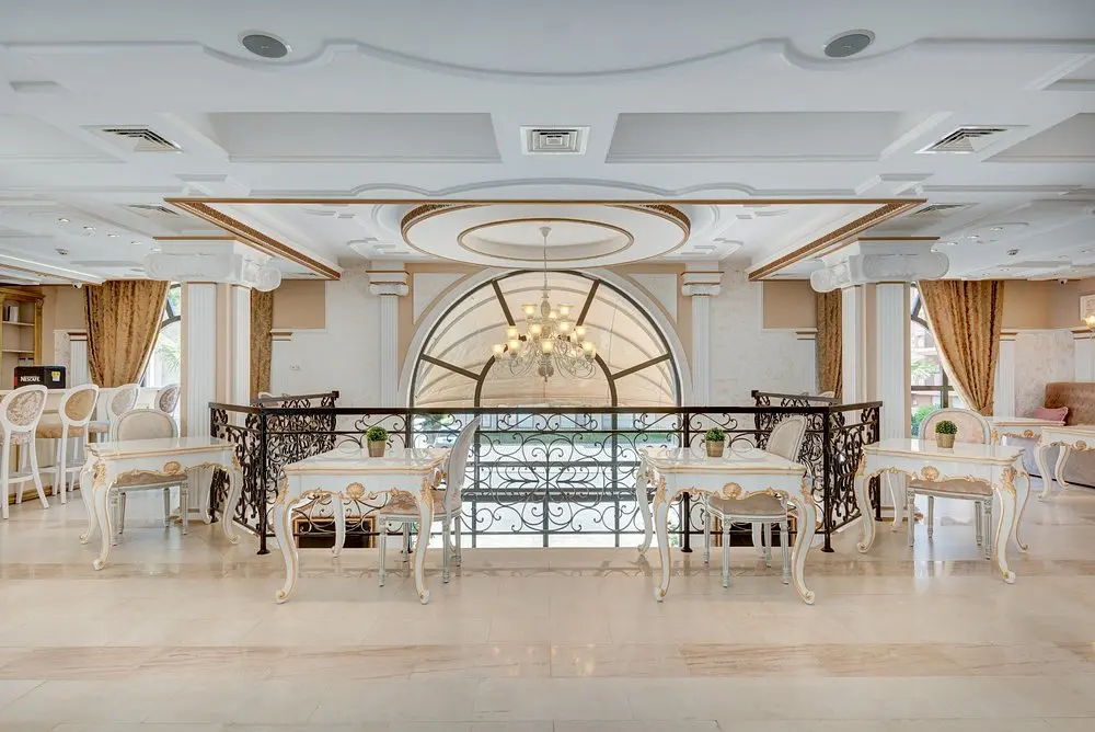 Оба корпуса соединены просторным лобби с баром, стойкой регистрации, рестораном и современным SPA-центром. Территория окружена ландшафтным садом с фонтанами, беседками и зонами для отдыха.
