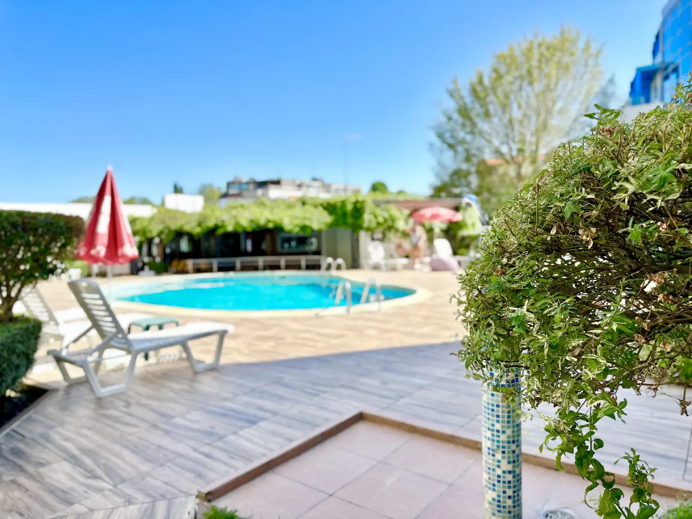 открытый бассейн с зоной отдыха и шезлонгами