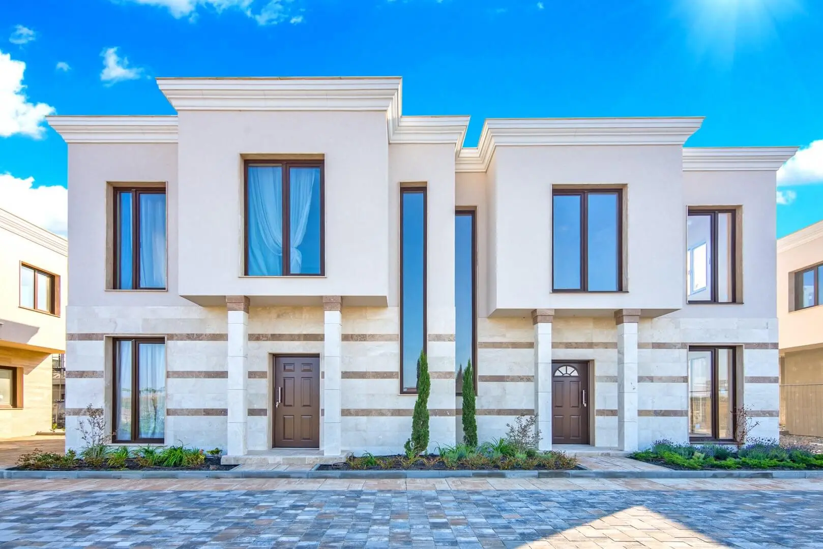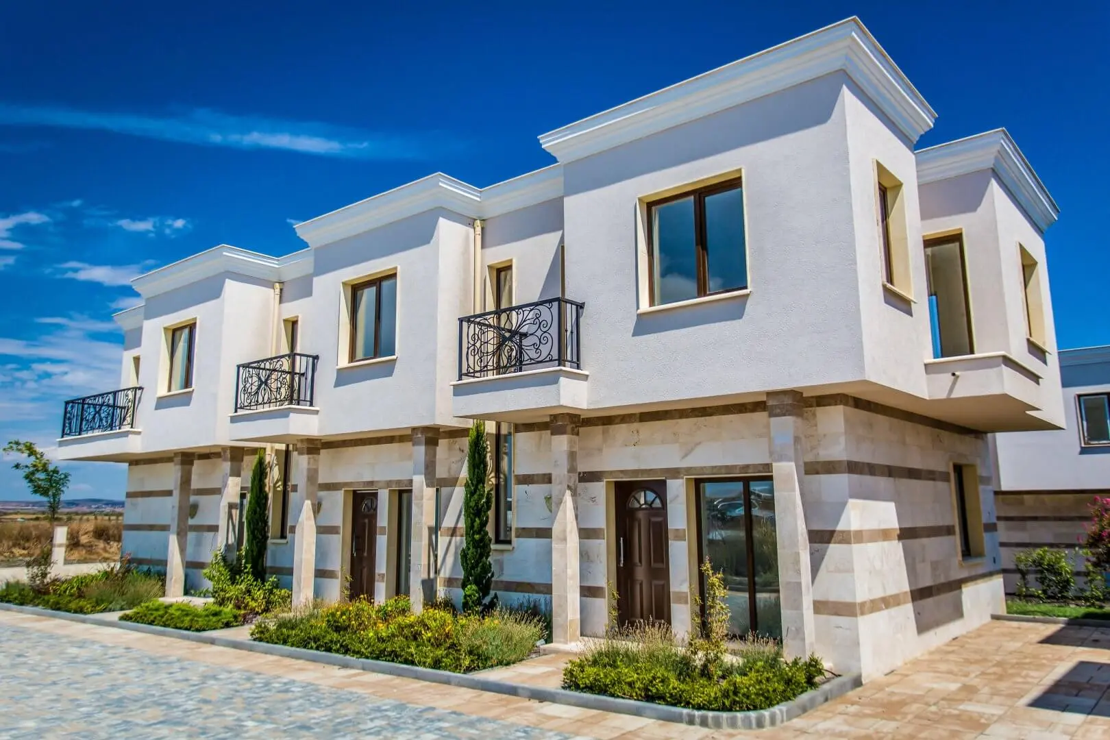 Архитектурный стиль Majestic Sea Village сочетает элементы неоклассики и средиземноморской эстетики. Декоративные карнизы, колоннады с капителями и оконные обрамления создают атмосферу курортных городов южной Европы. Все здания выполнены по монолитной железобетонной технологии с высокими требованиями к надёжности, тепло- и гидроизоляции. Планировки домов продуманы для комфортного круглогодичного проживания.