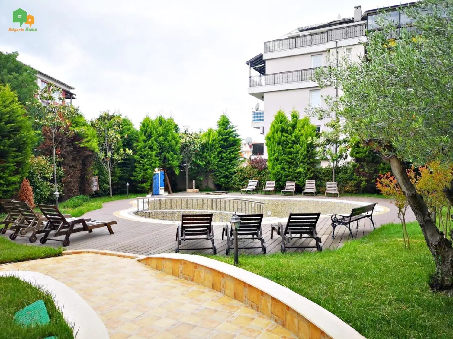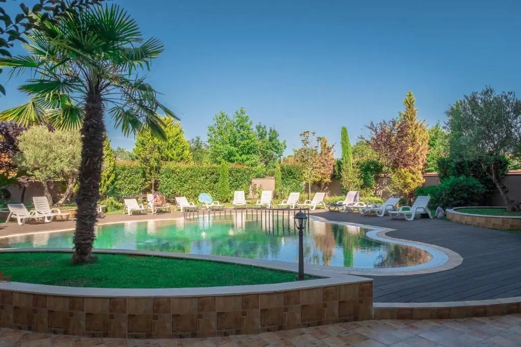Просторный бассейн с детской секцией и зона отдыха с шезлонгами
