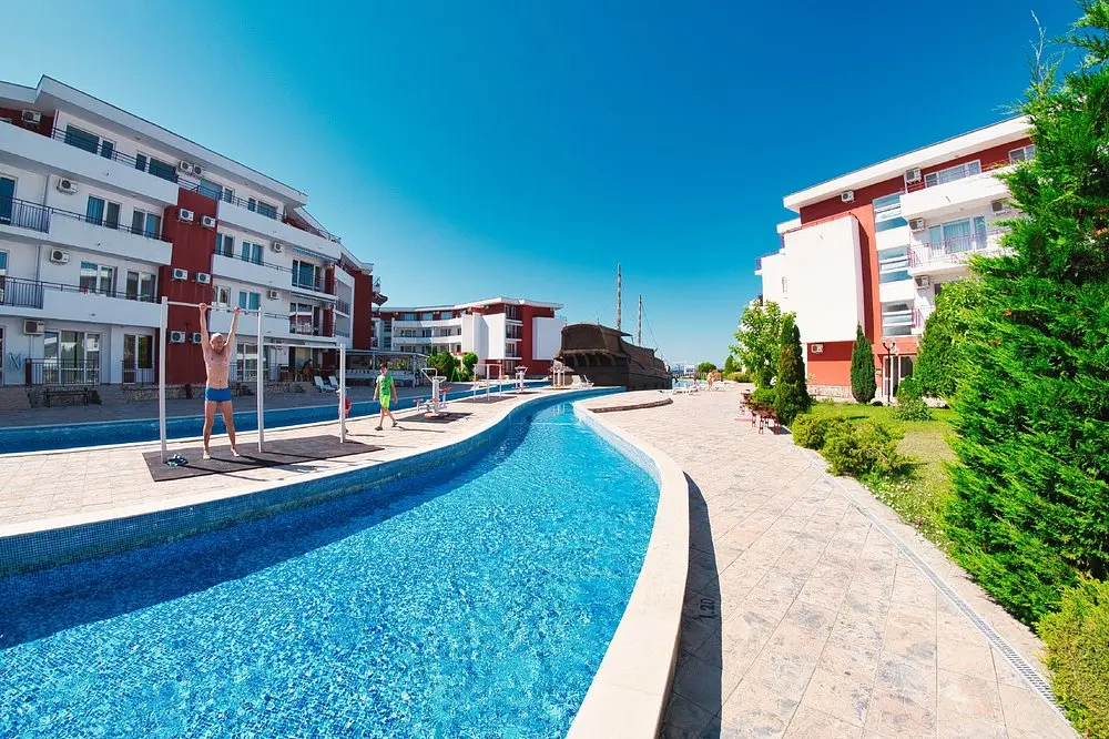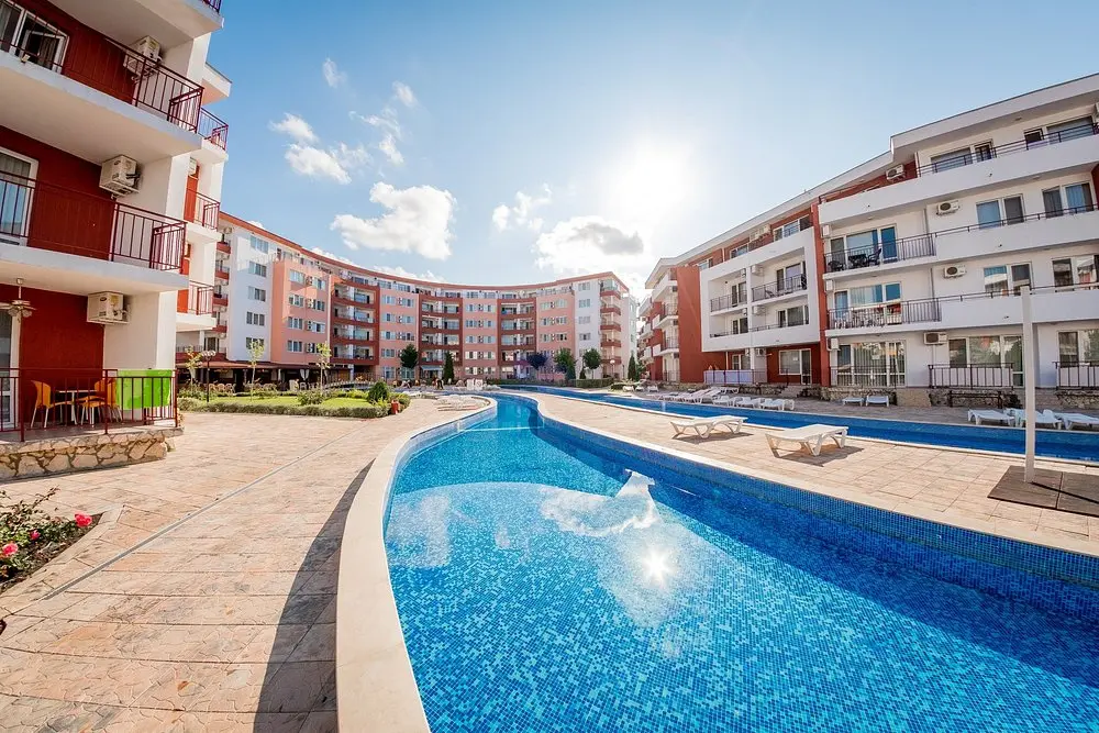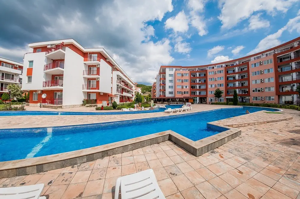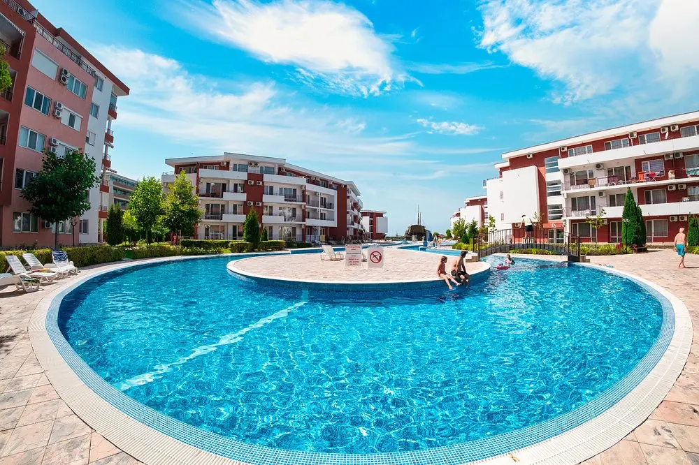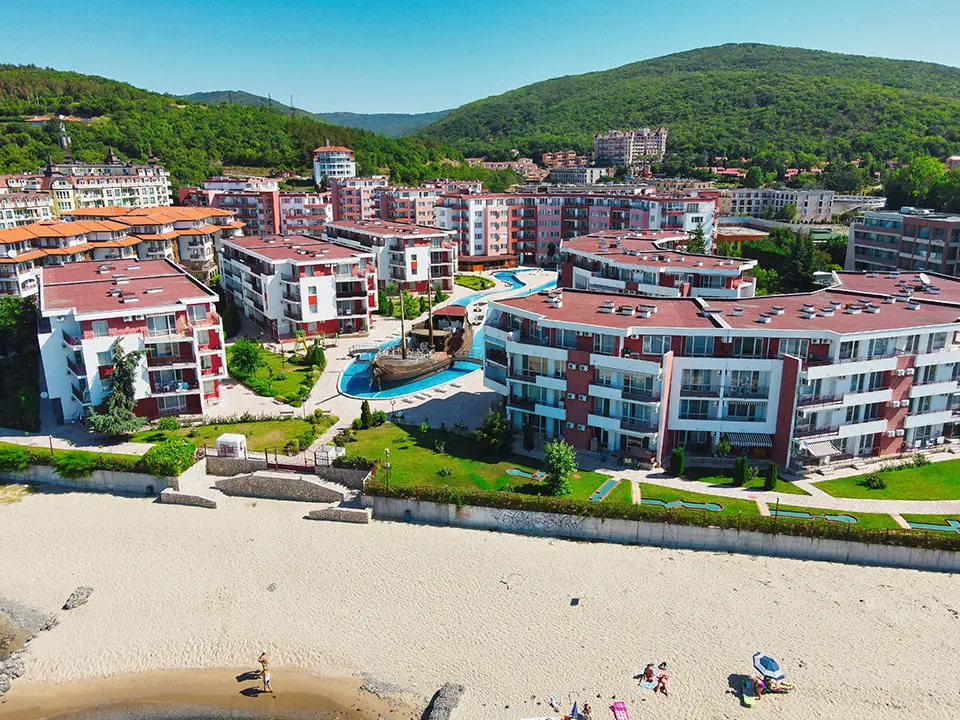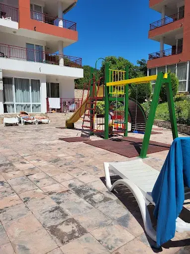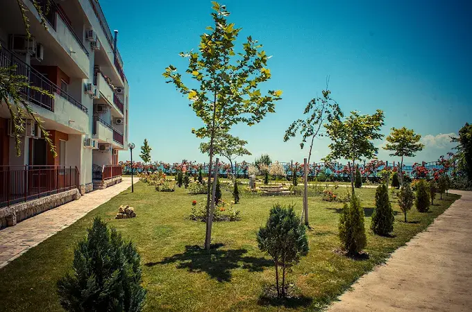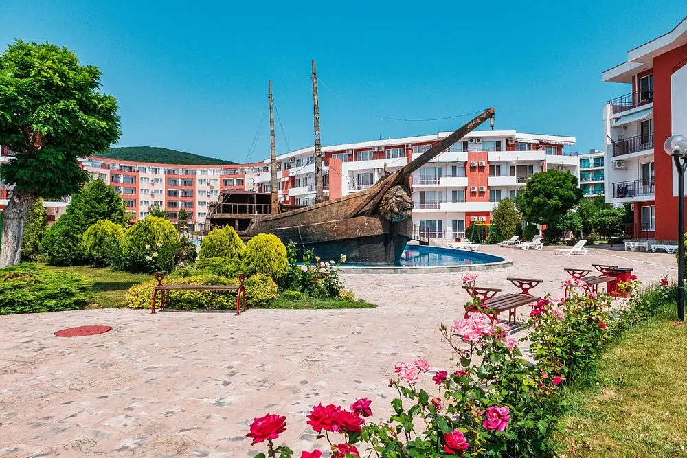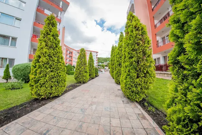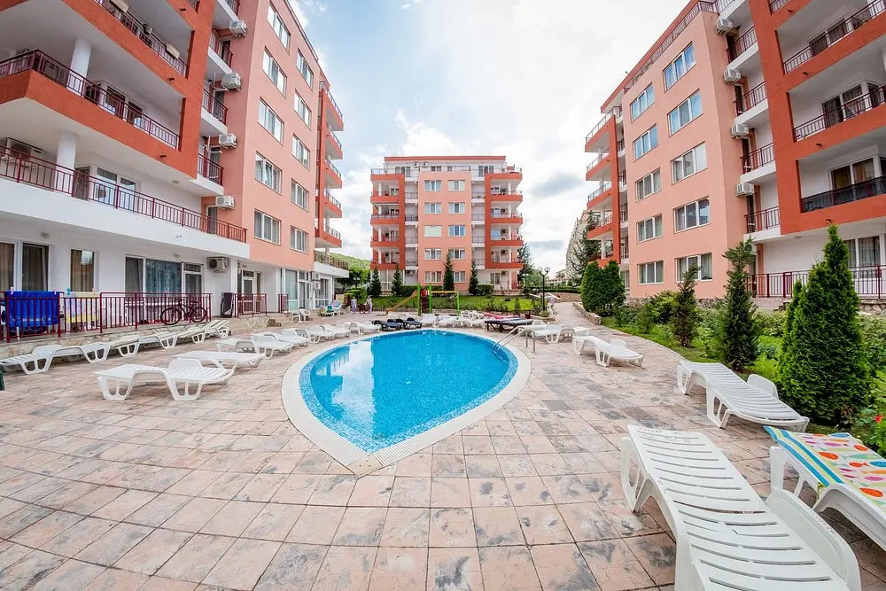 Комплекс находится в спокойной и зелёной зоне, при этом рядом есть вся необходимая внешняя инфраструктура: аквапарк, супермаркеты, остановки общественного транспорта, такси и удобное сообщение с курортами Солнечный Берег и Святой Влас. Это место идеально подходит как для отдыха, так и для круглогодичного проживания.