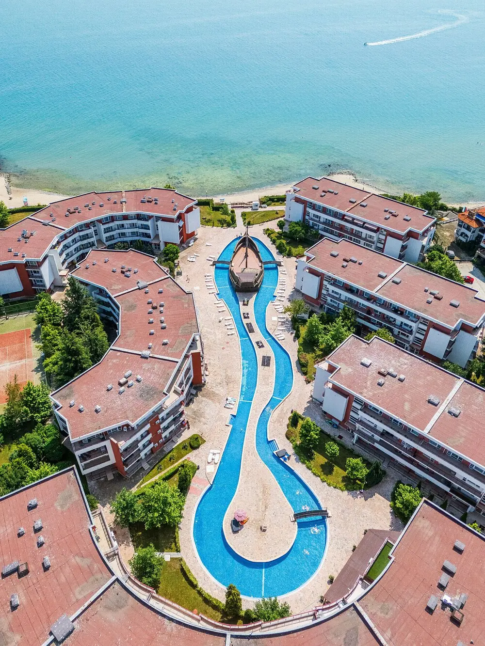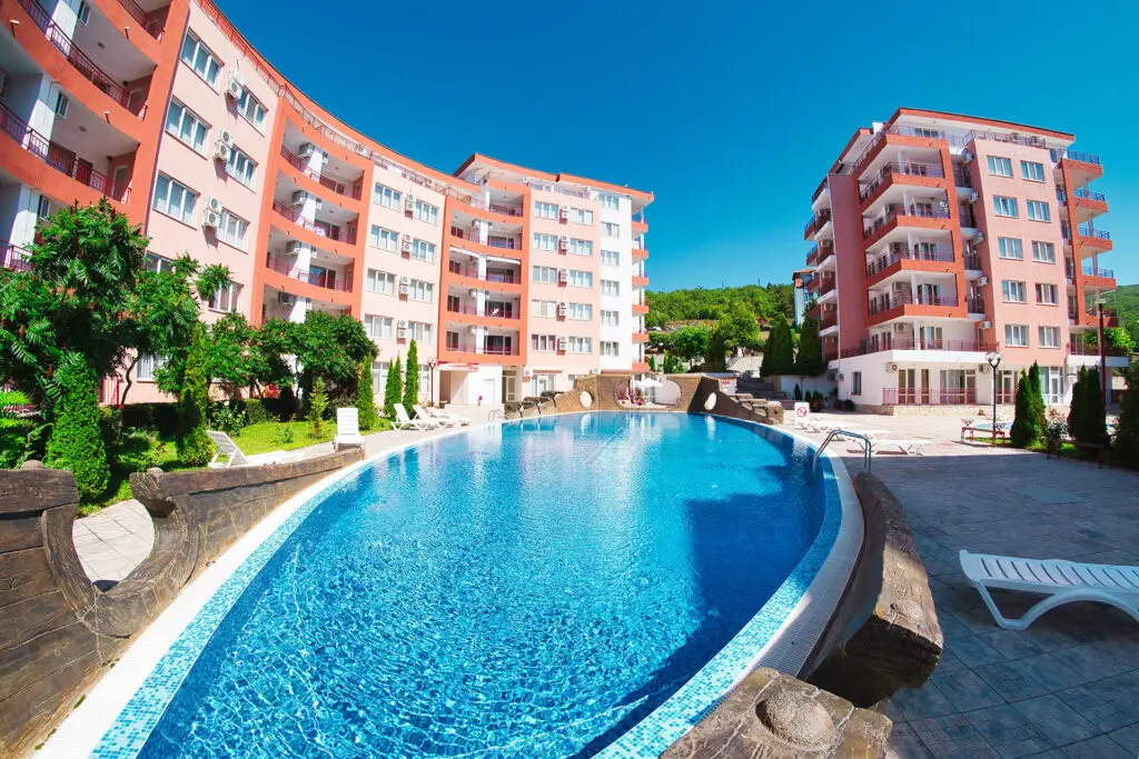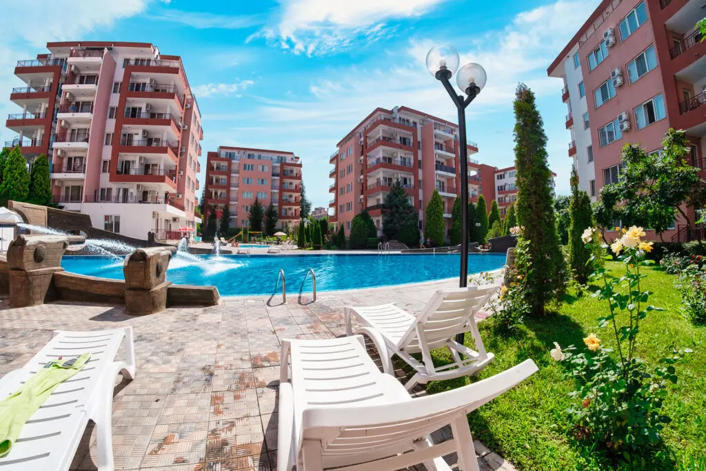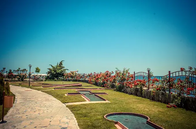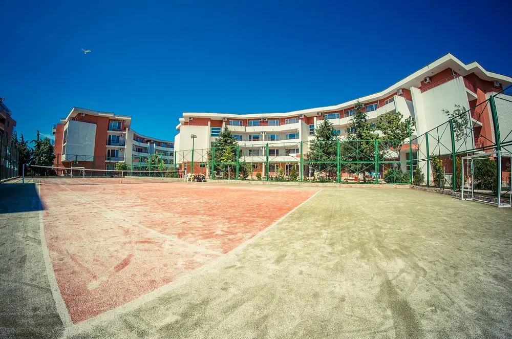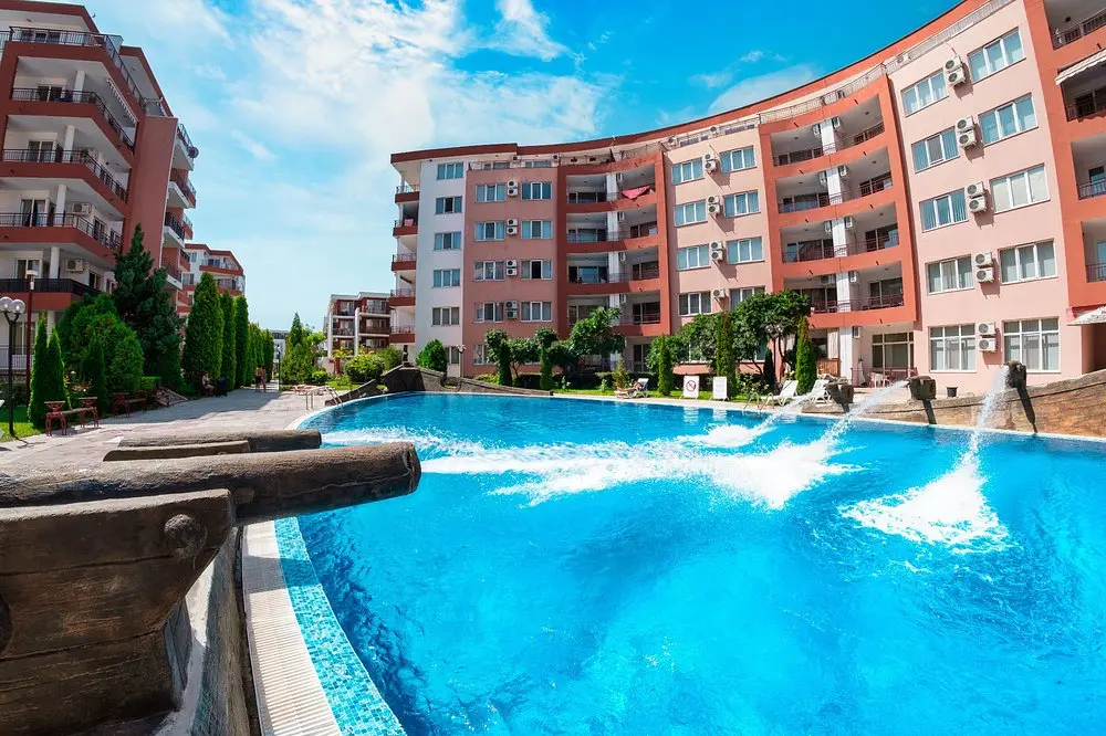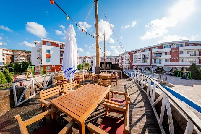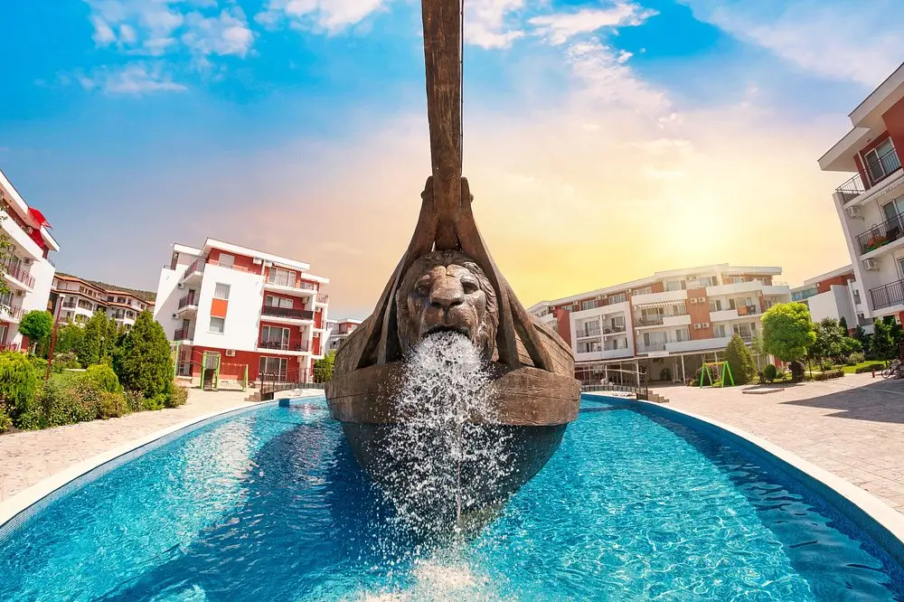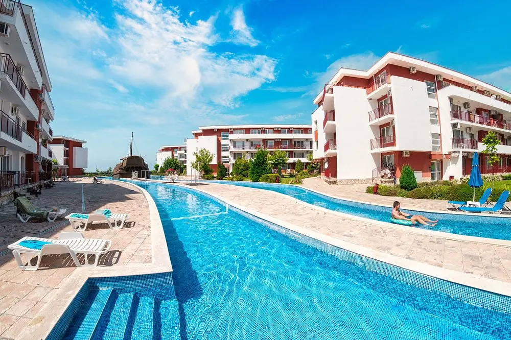 Комплекс находится в спокойной и зелёной зоне, при этом рядом есть вся необходимая внешняя инфраструктура: аквапарк, супермаркеты, остановки общественного транспорта, такси и удобное сообщение с курортами Солнечный Берег и Святой Влас. Это место идеально подходит как для отдыха, так и для круглогодичного проживания.