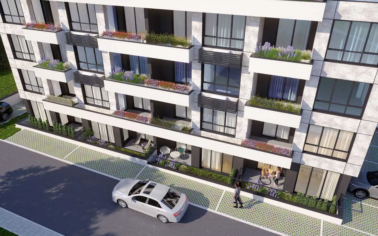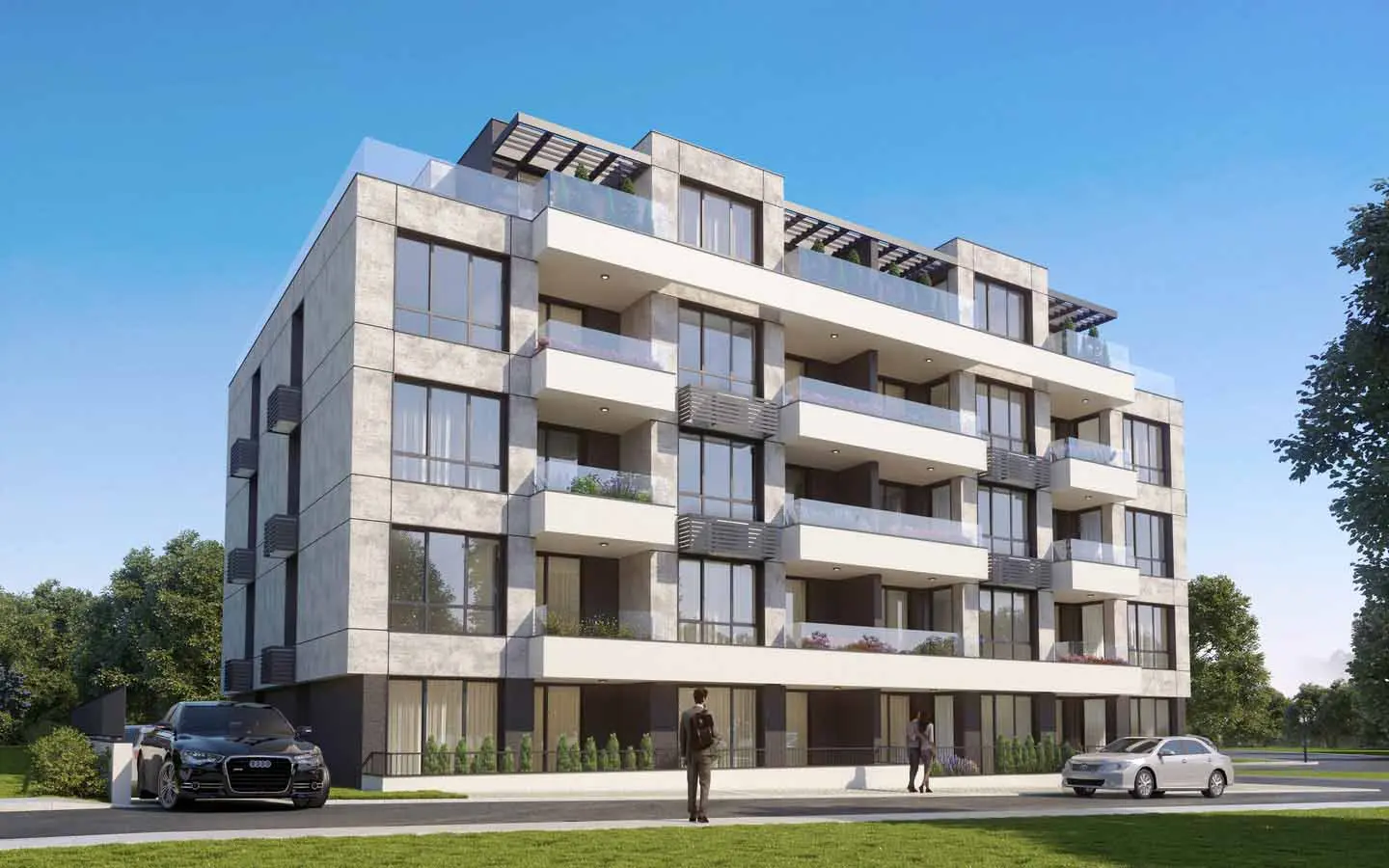 Пятиэтажное современное здание: проект включает 30 функциональных квартир — студии, двухкомнатные и трёхкомнатные планировки, а также гаражи и открытые парковочные места.