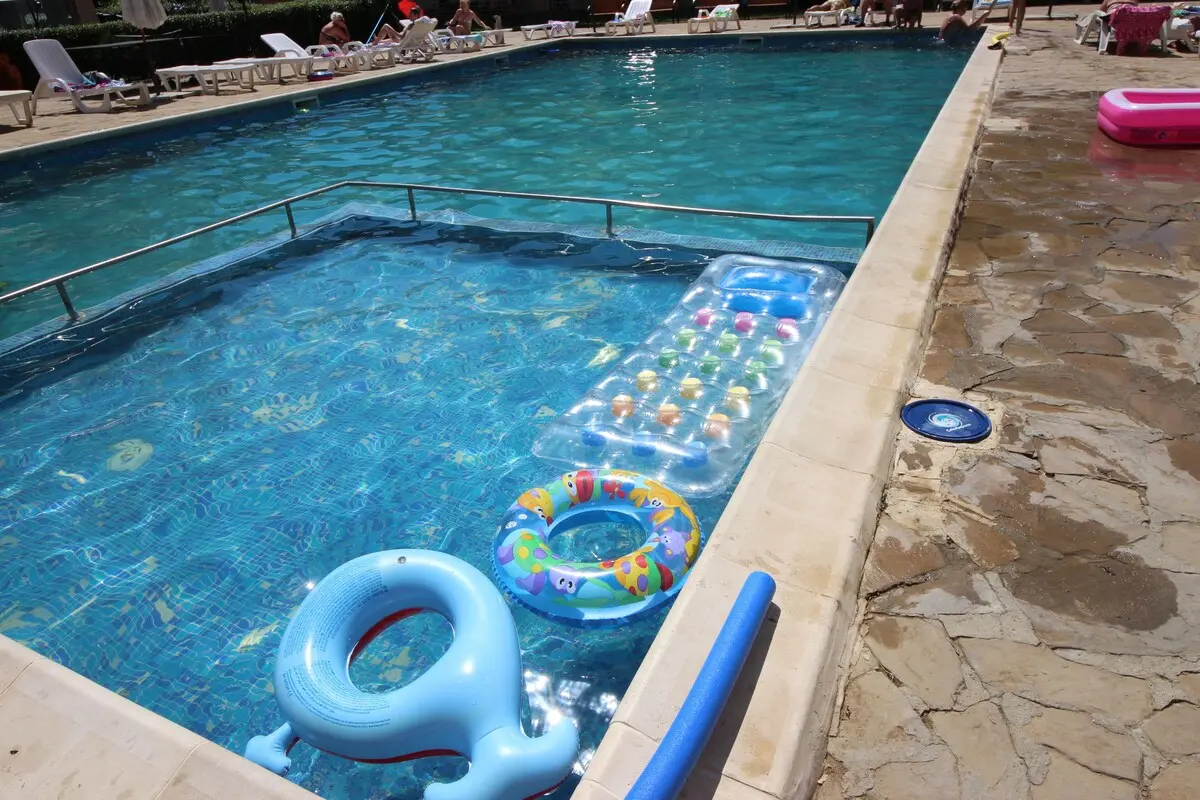 большой открытый бассейн с зоной для отдыха