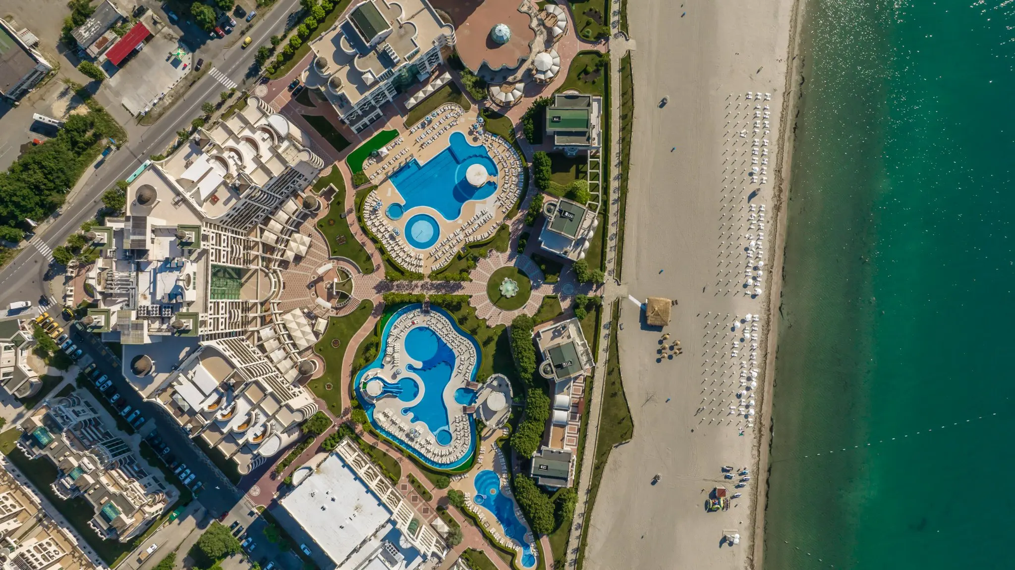Sunset Resort — это масштабный пятизвездочный курортный комплекс, расположенный прямо на первой береговой линии Южного пляжа в городе Поморие. Проект сочетает впечатляющую архитектуру, высокий уровень сервиса и разнообразие удобств, создавая идеальные условия как для отдыха, так и для комфортного проживания у моря. Расстояние до пляжа составляет всего 20 метров, что позволяет наслаждаться морским воздухом и видом на залив ежедневно.