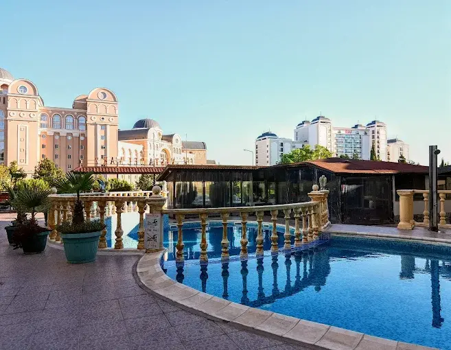 Открытый бассейн с зоной отдыха и шезлонгами
