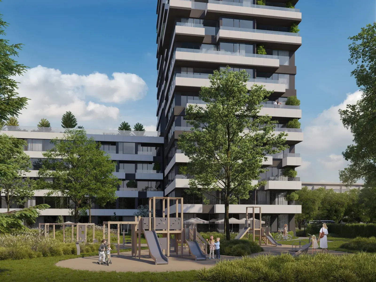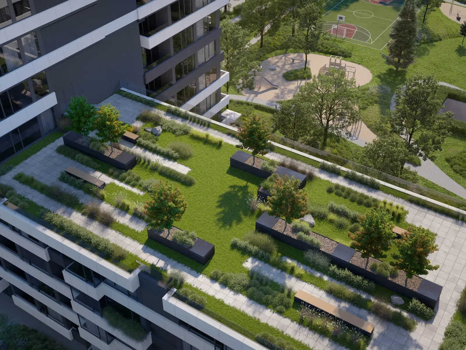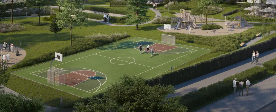 Одним из ключевых преимуществ Iconica является собственный частный парк площадью 5 845 м², расположенный в южной части комплекса. Здесь созданы ухоженные аллеи со скамейками, детские площадки, открытый тренажёрный зал и многофункциональная спортивная зона — идеальная среда для активного и сбалансированного образа жизни.