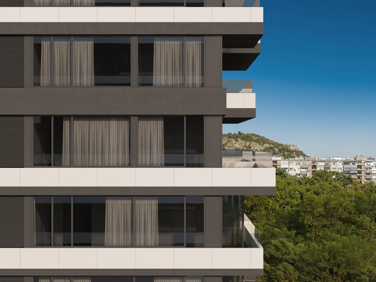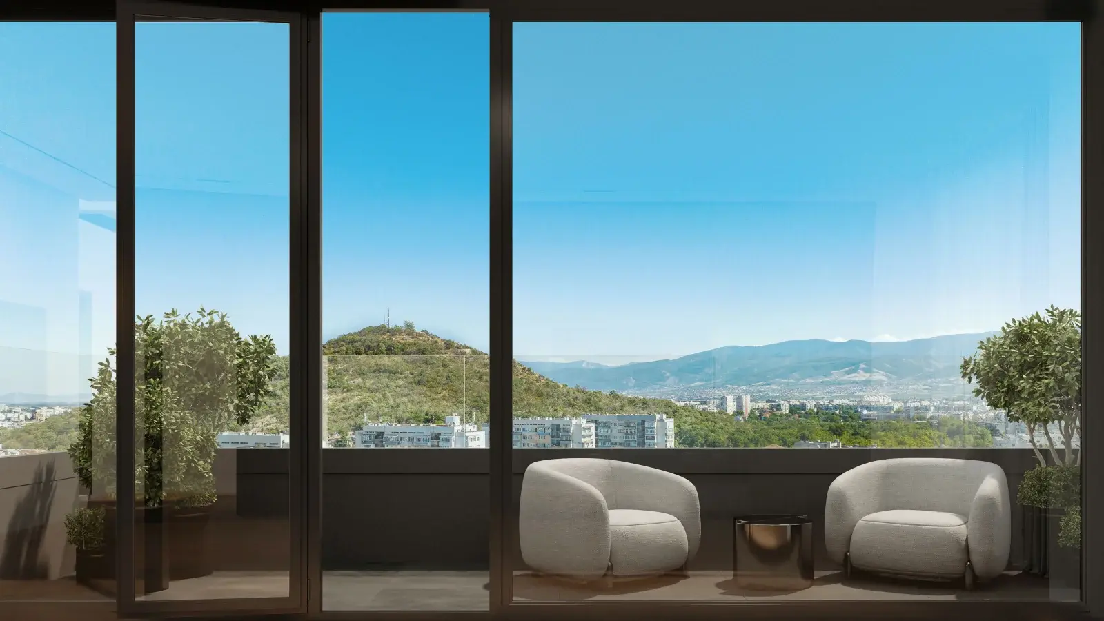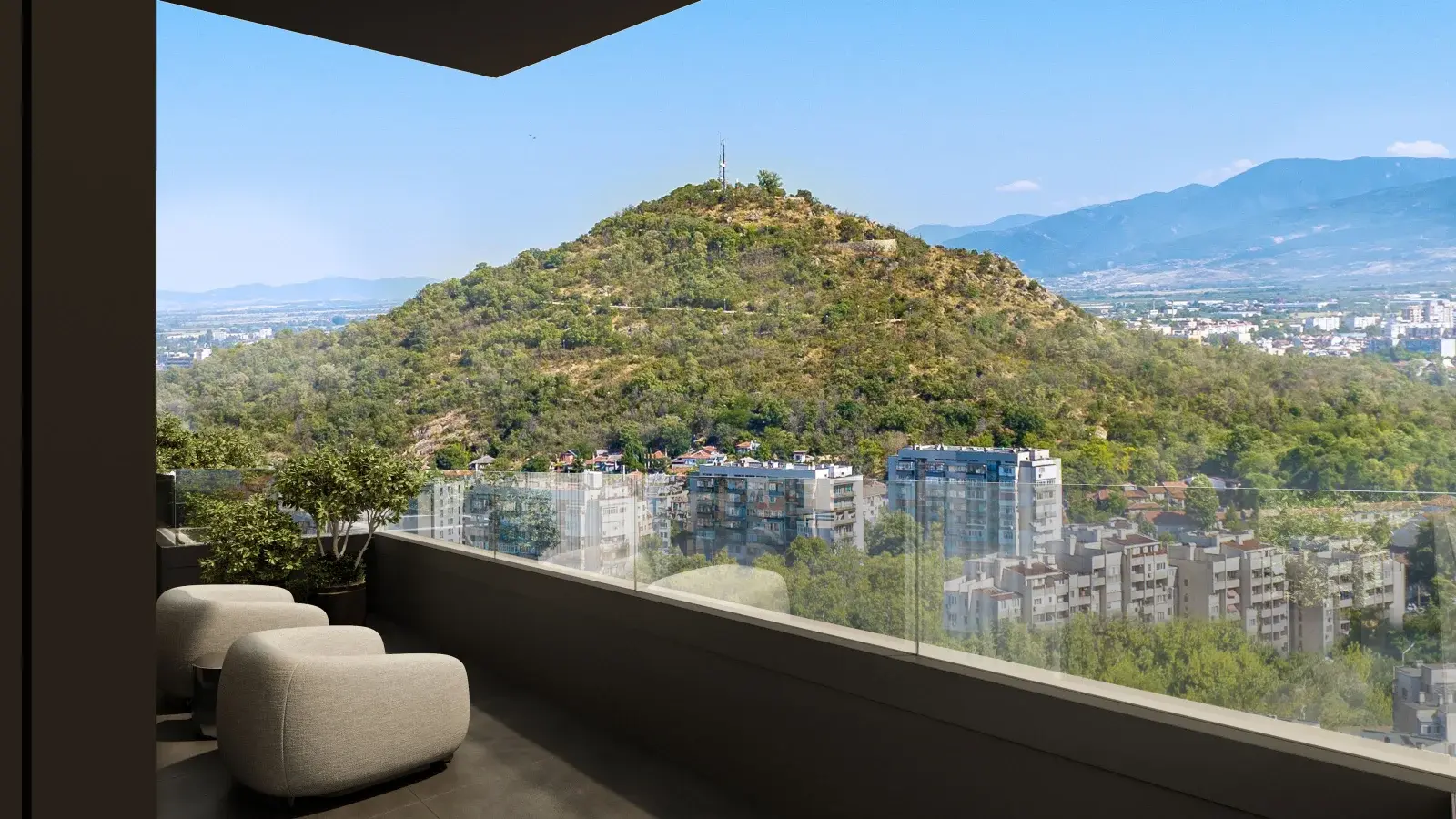 В интерьерах общих зон используются натуральные оттенки, дерево, металл и керамика, что формирует элегантную, тёплую и одновременно современную атмосферу. Большие панорамные окна наполняют апартаменты естественным светом и открывают виды на зелёные зоны, холмы Пловдива и городское пространство.