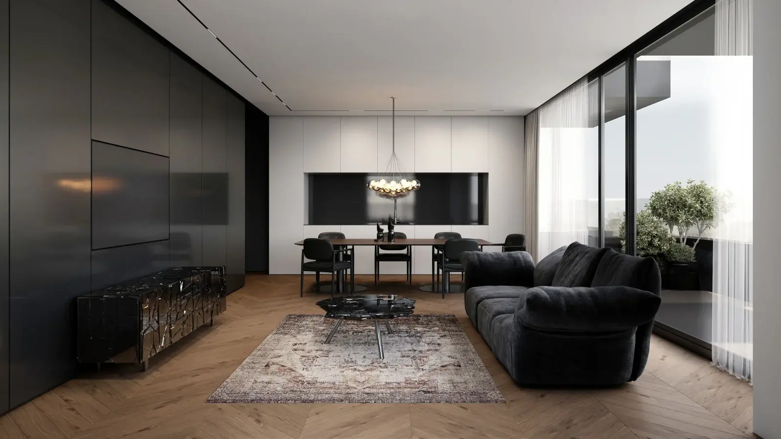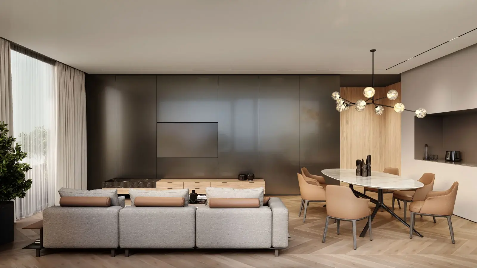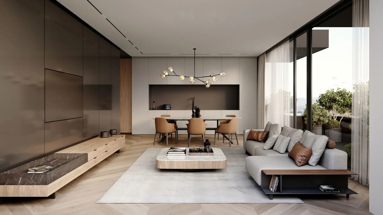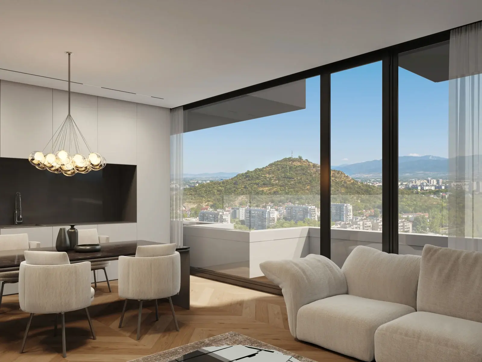 В интерьерах общих зон используются натуральные оттенки, дерево, металл и керамика, что формирует элегантную, тёплую и одновременно современную атмосферу. Большие панорамные окна наполняют апартаменты естественным светом и открывают виды на зелёные зоны, холмы Пловдива и городское пространство.