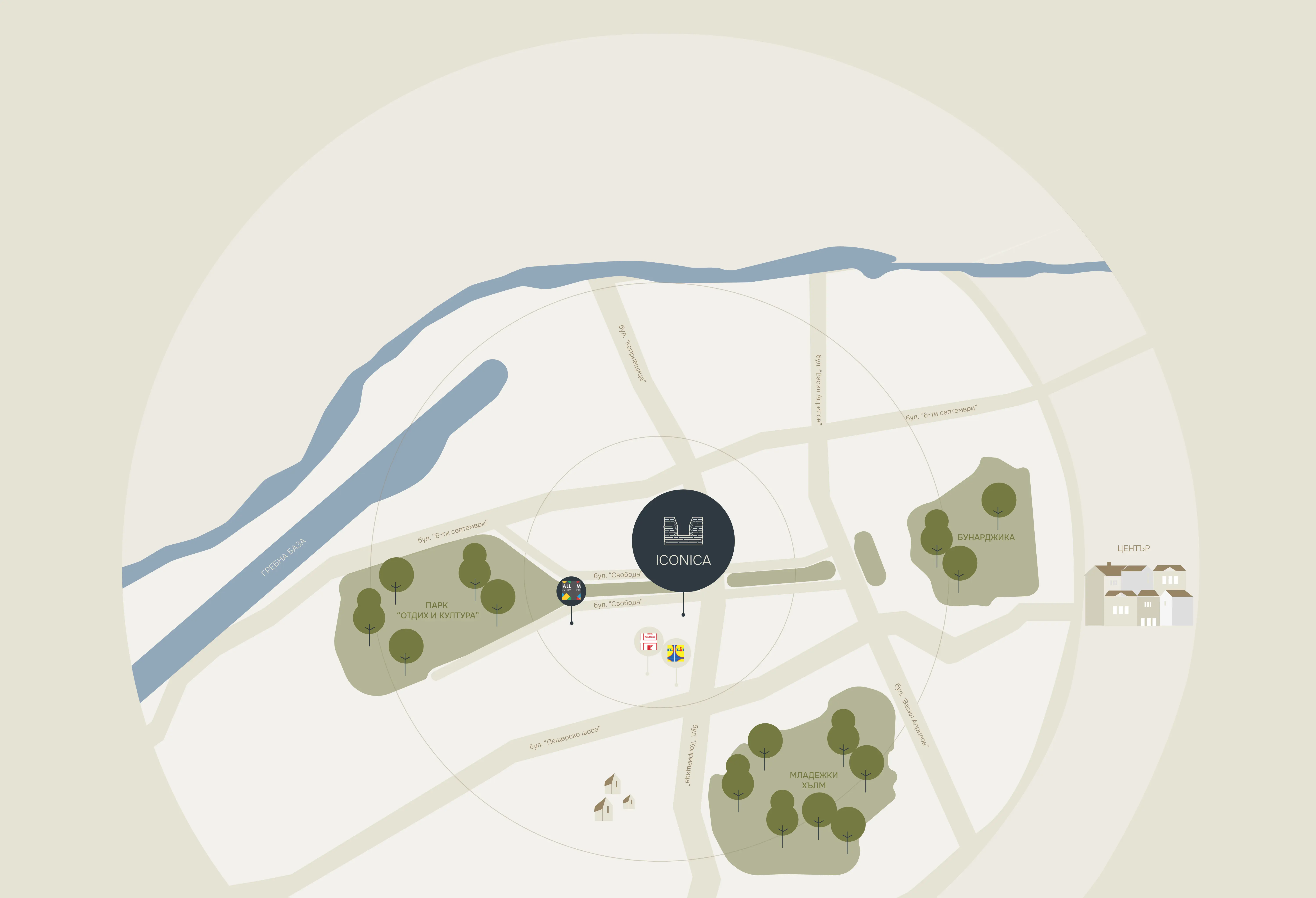 Iconica — это масштабный и концептуально продуманный жилой комплекс, расположенный в одном из самых престижных и зелёных районов Пловдива — Отдых и культура. Проект создан для тех, кто ценит высокое качество жизни, эстетику современной архитектуры и близость к природе, не отказываясь от всех преимуществ городской инфраструктуры. Окончание строительства запланировано на 2027 год. Средняя цена недвижимости в комплексе составляет около 1800 € / м².