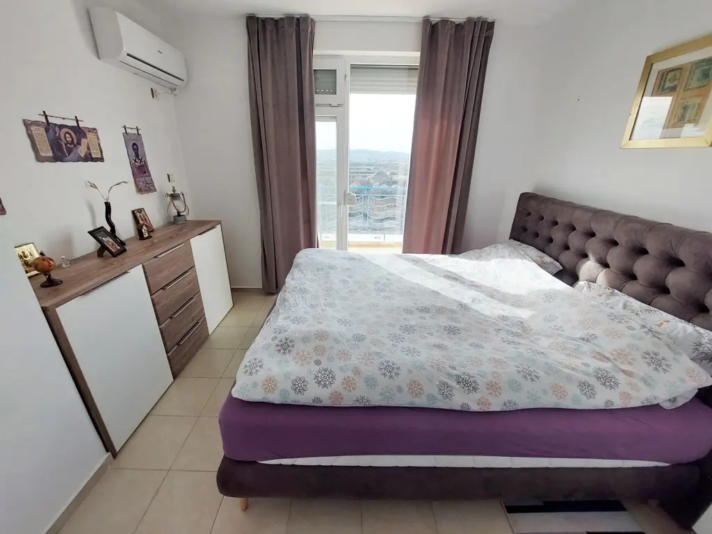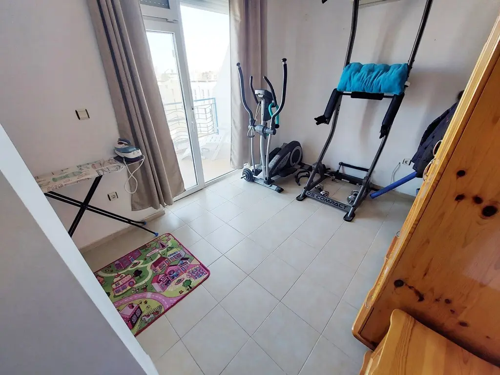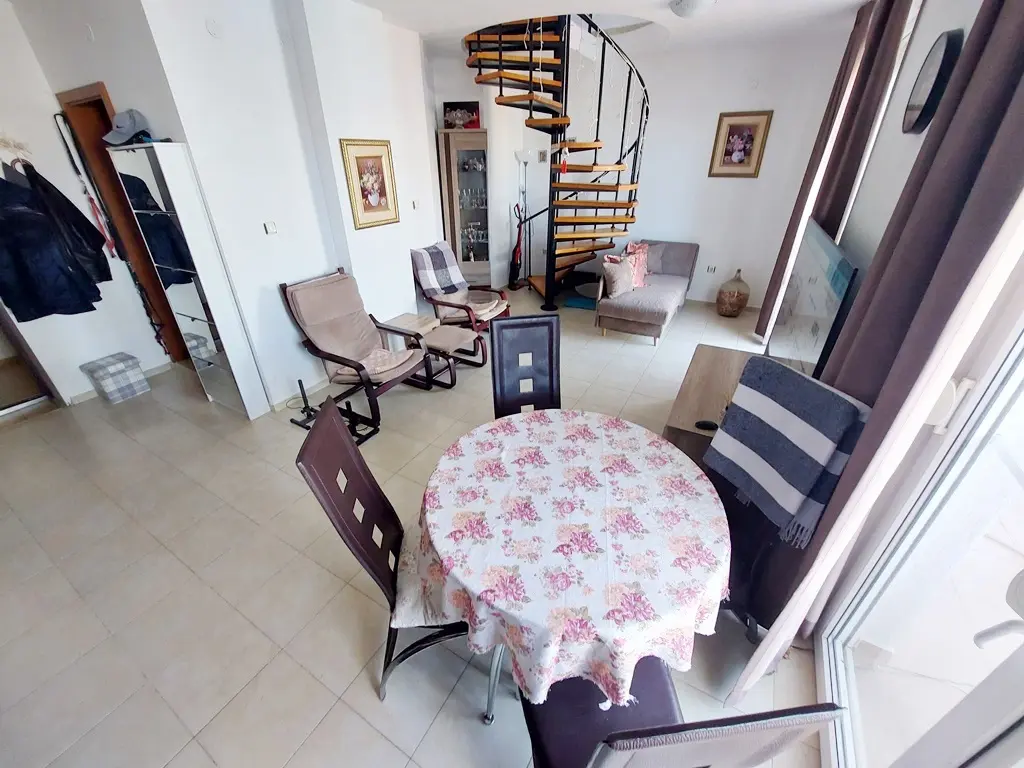 На нижнем уровне расположены: просторная гостиная с кухонной зоной, ванная комната и терраса. Верхний этаж включает: две отдельные спальни, дополнительную комнату (подходит как детская, кабинет или гардеробная), ещё одну ванную комнату и террасу. Квартира полностью меблирована и оснащена бытовой техникой. Состояние отличное — подходит для круглогодичного проживания, отдыха и сдачи в аренду.