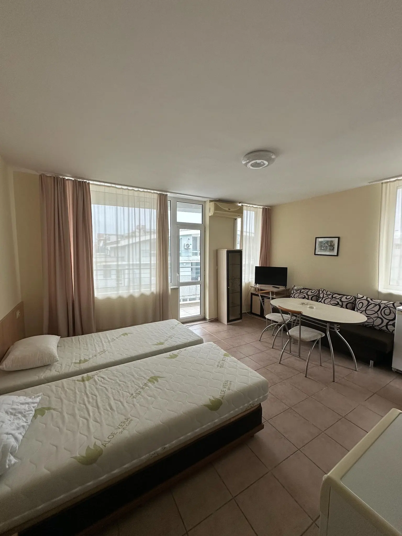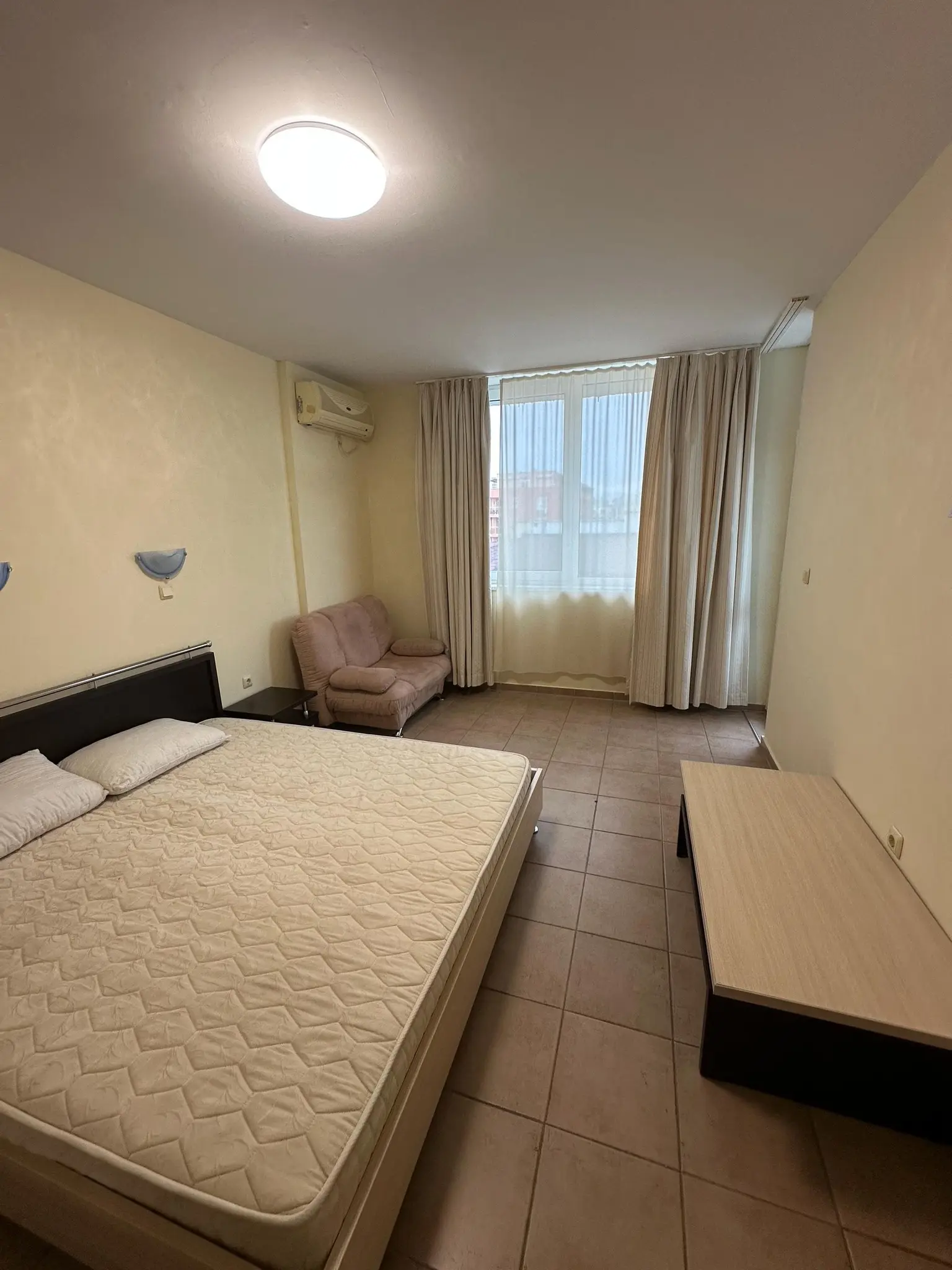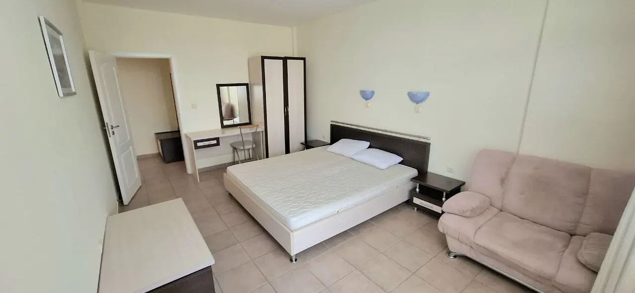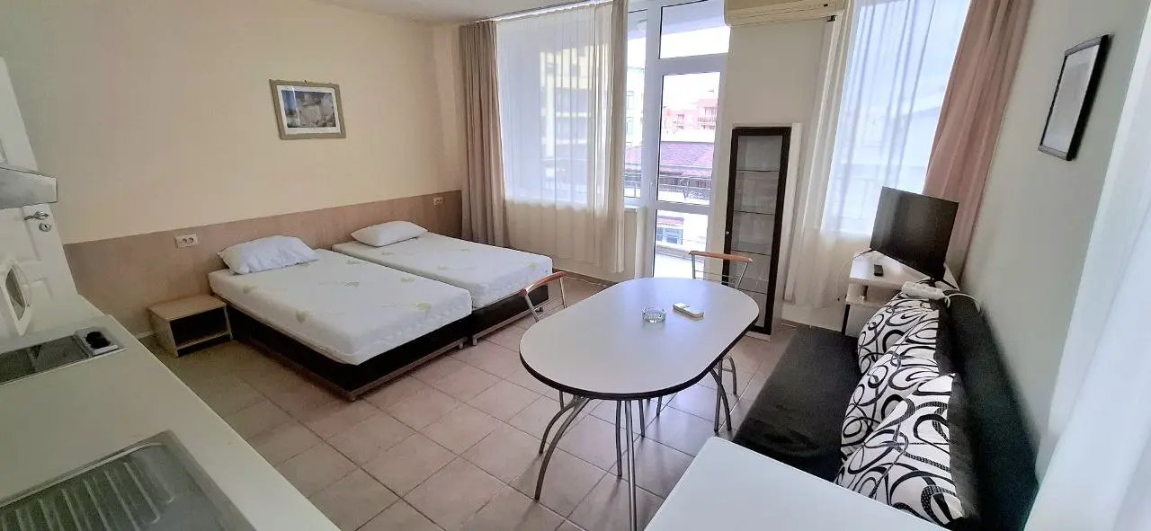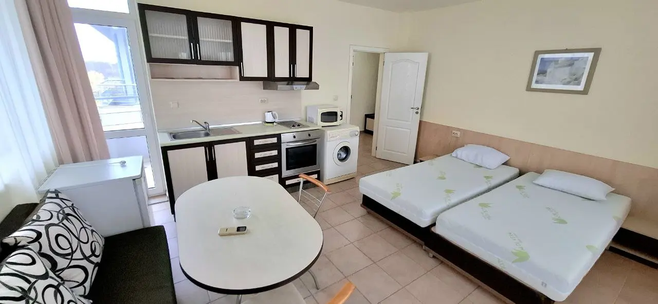 Предлагается к продаже двухкомнатная квартира в комплексе Favorit на курорте Солнечный Берег. Апартамент площадью 65 м² расположен на 4 этаже и предлагается по цене €85 000. Квартира включает гостиную с кухонной зоной, отдельную спальню, ванную комнату и две террасы с видом во внутренний двор комплекса и море. Жилье полностью меблировано и оснащено техникой, готово к проживанию или сдаче в аренду. Годовая такса обслуживания составляет €400, что делает содержание доступным. До моря 250 м, акт 16. Квартира отличается удобной планировкой и подойдет как для отдыха, так и для инвестиций.