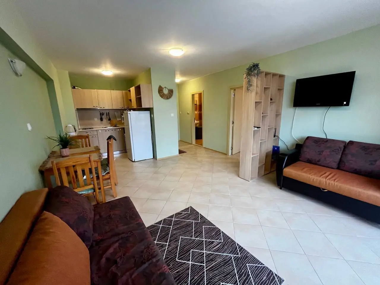 В благоустроенном жилом комплексе Grand Kamelia на курорте Солнечный Берег предлагается уютная двухкомнатная квартира площадью 75 м², расположенная на 5-м этаже 6-этажного здания с лифтом, с приятным видом на бассейн и территорию комплекса. Объект продаётся за 79 000 €, имеет Акт 16 и полностью готов к проживанию или сдаче в аренду. До пляжа около 600 м, что позволяет дойти пешком за несколько минут, а ежегодная такса обслуживания составляет 420 €, обеспечивая ухоженную территорию и сервис комплекса.