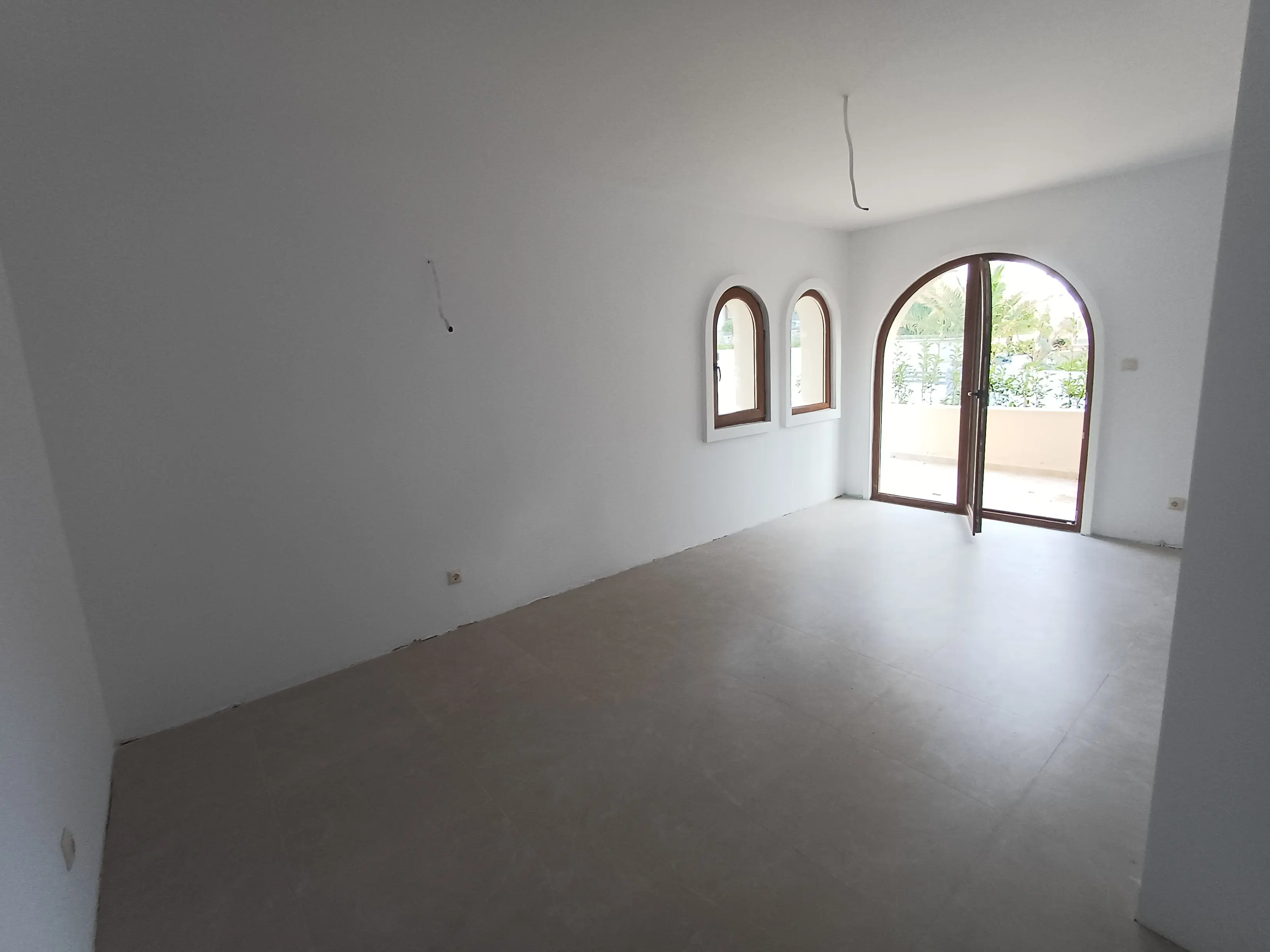 Квартира состоит из комфортной гостиной с кухонной зоной, отдельной спальни, двух санузлов и большой террасы с выходом на зелёную лужайку и двор. Жильё полностью отремонтировано, в идеальном состоянии и готово к меблировке. Такса обслуживания составляет 12 €/м² в год. Расстояние до моря — примерно 3 км.