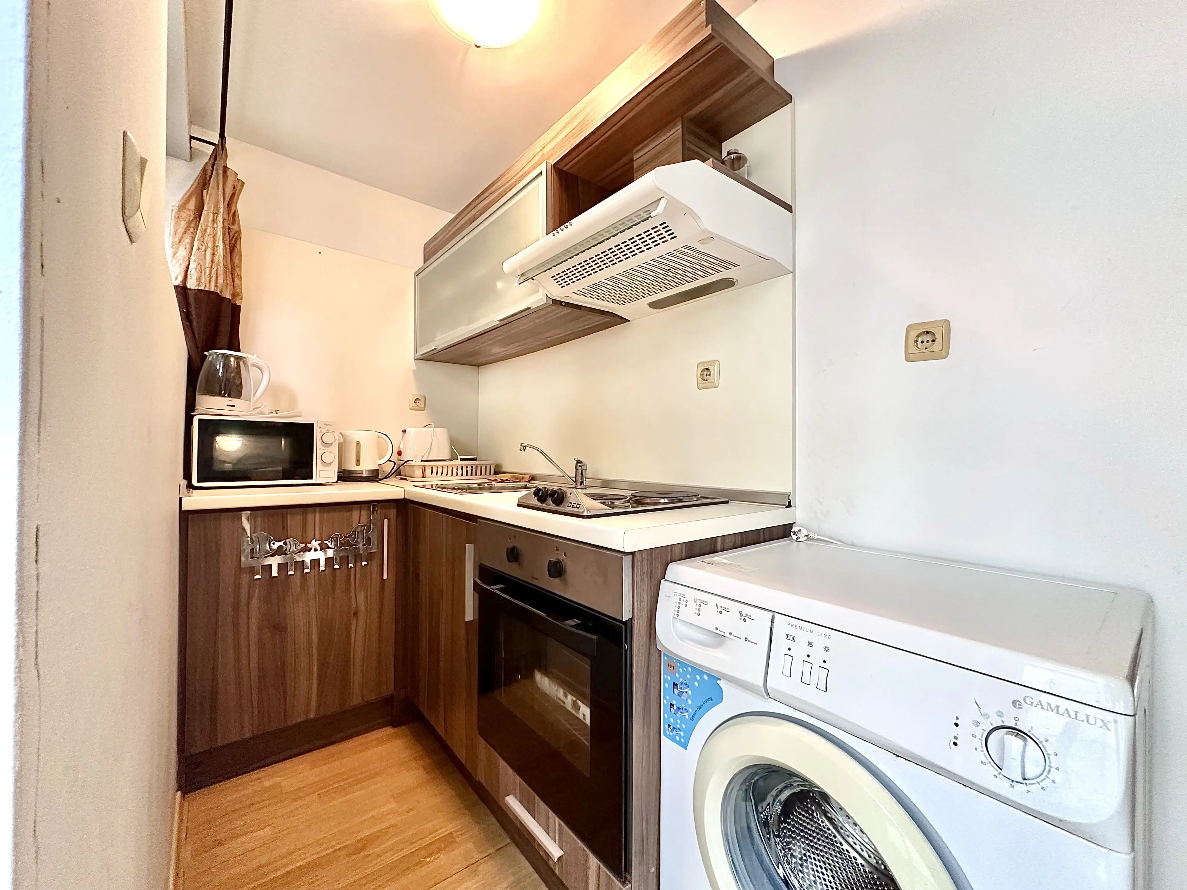 Двухкомнатная квартира общей площадью 75 м² расположена на 1 этаже (партер) комплекса Panorama Bay 1 в Святом Власе и предлагается по цене 100 000 €. Объект с Актом 16 и таксой поддержки 10,00 € за м² в год полностью меблирован и готов к проживанию или сдаче в аренду. Из окон и с выхода в общие зоны открывается вид на бассейн и зелёный двор комплекса, а до моря около 400 м, что удобно для ежедневных прогулок к пляжу и курортного образа жизни.