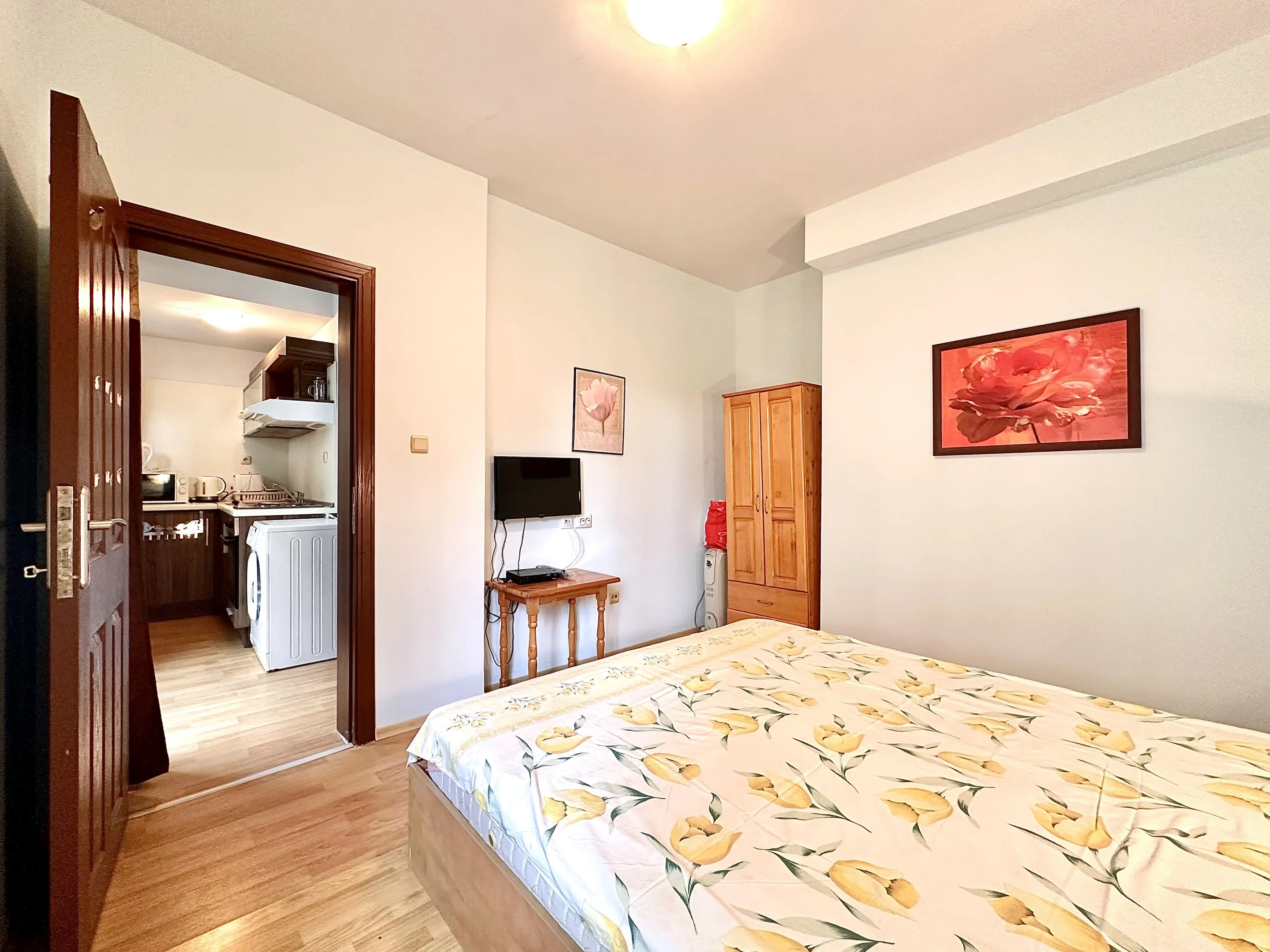 Квартира состоит из: прихожей, просторной гостиной с мини-кухней и выходом в общие зоны, спальни, ванной комнаты с туалетом и душевой кабиной.