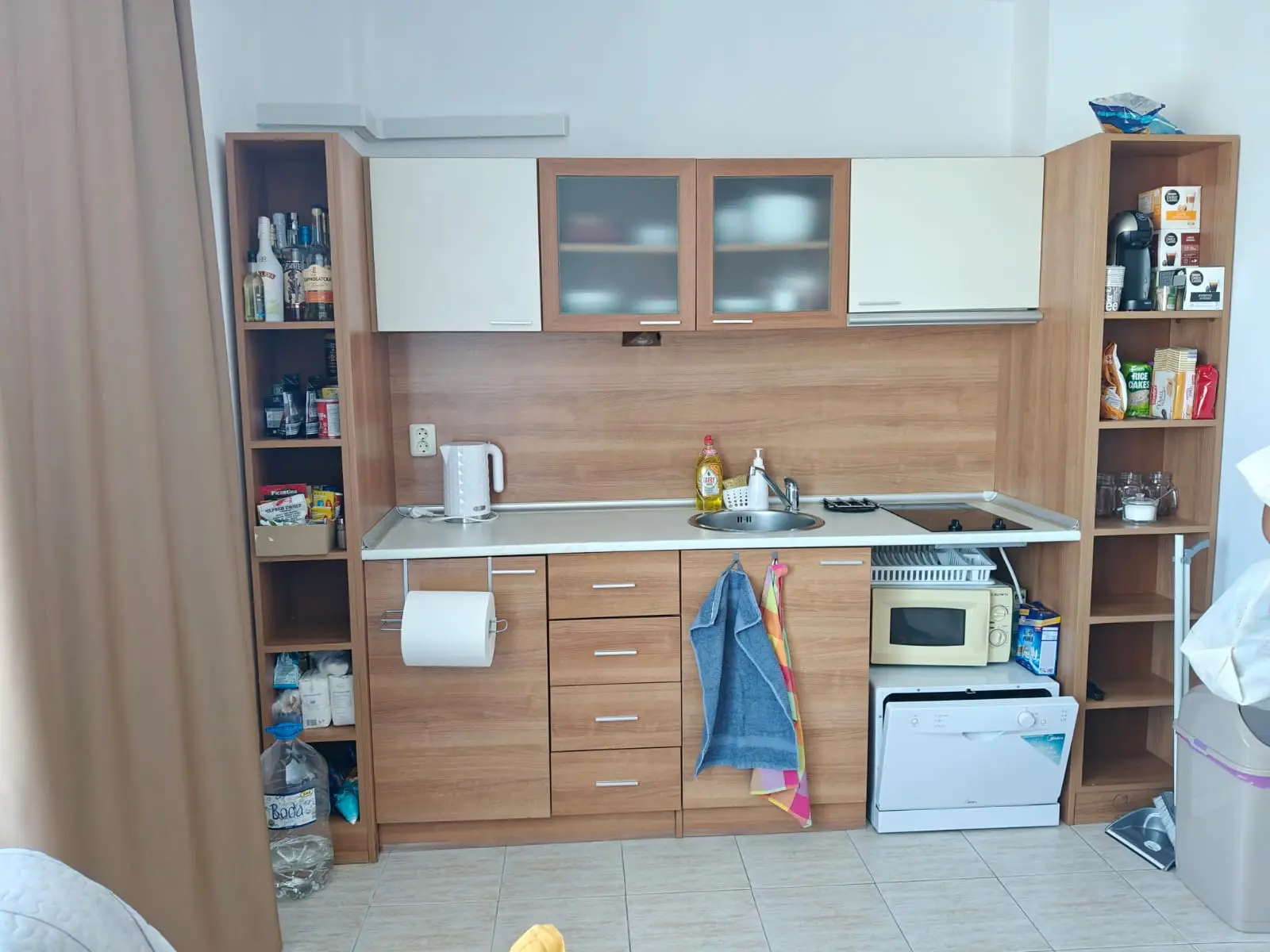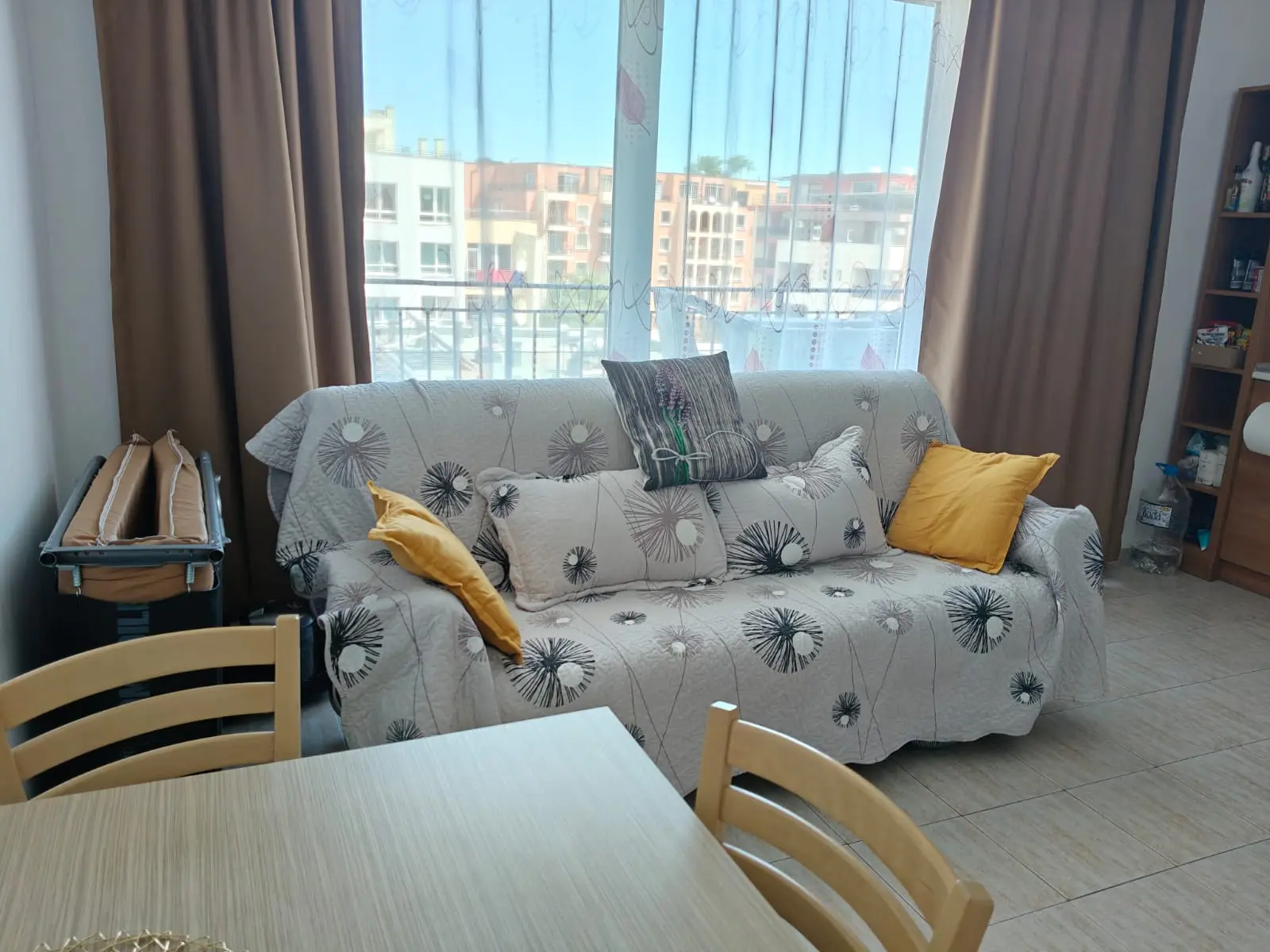 Просторная и светлая квартира с отдельной спальней и уютной гостиной, объединённой с функциональной мини-кухней, расположена на 5 этаже, имеет площадь 60 м² и балкон с видом на бассейн. Апартамент полностью готов к проживанию: установлены 2 кондиционера, в ванной комнате — душевая кабина и стиральная машина, в спальне новое напольное покрытие. Такса поддержки составляет 10 €/м² в год, а цена квартиры — 84 000 €.