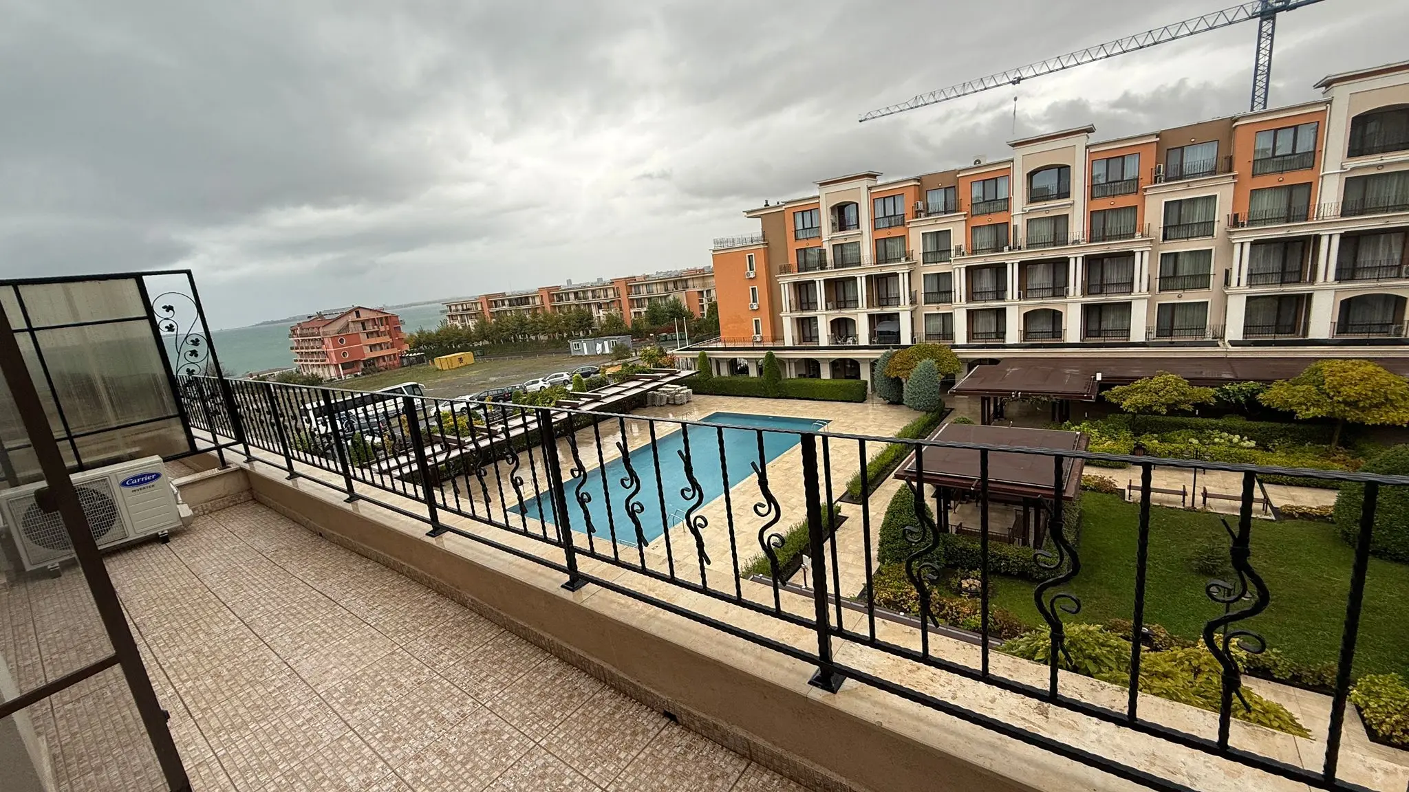 Просторная двухкомнатная квартира площадью 83 м² расположена на 3 этаже комплекса на первой линии моря. Цена — 159 000 €, такса поддержки — 21,00 € за м² в год. Апартамент с Актом 16, с видом на море и бассейн, дорога до пляжа занимает 2 минуты. Планировка включает гостиную с кухонной зоной, отдельную спальню, ванную комнату и большой балкон для отдыха. Квартира меблирована и полностью готова к проживанию или аренде.