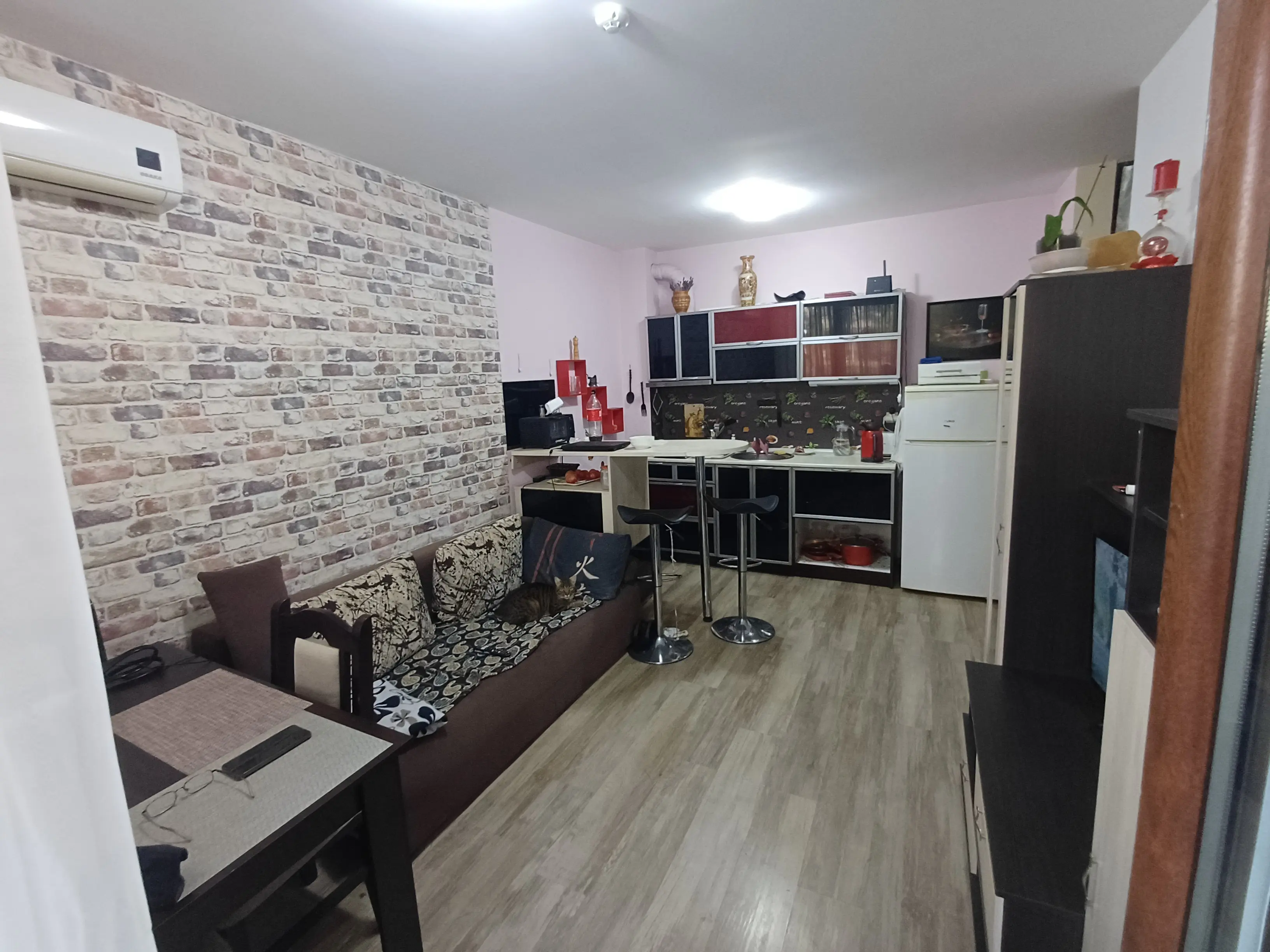 Квартира имеет продуманную планировку, комфортную как для отдыха, так и для круглогодичного проживания: просторная гостиная с кухонной зоной, отдельная спальня, прихожая, ванная комната с туалетом и большая терраса. С террасы предусмотрен прямой выход на внутренний двор и к бассейну, что особенно удобно для семей с детьми и любителей отдыха на свежем воздухе.