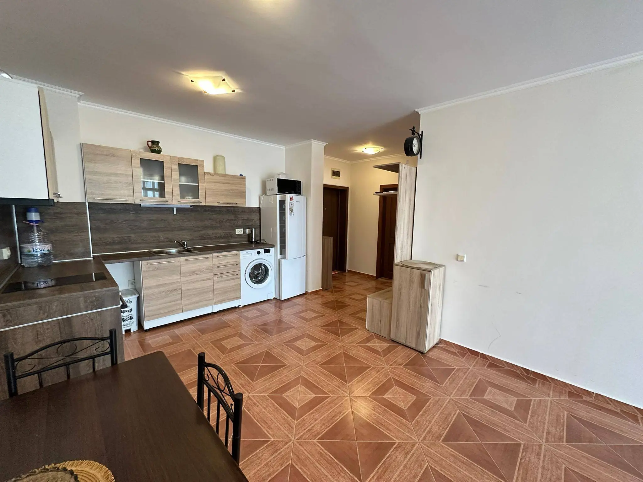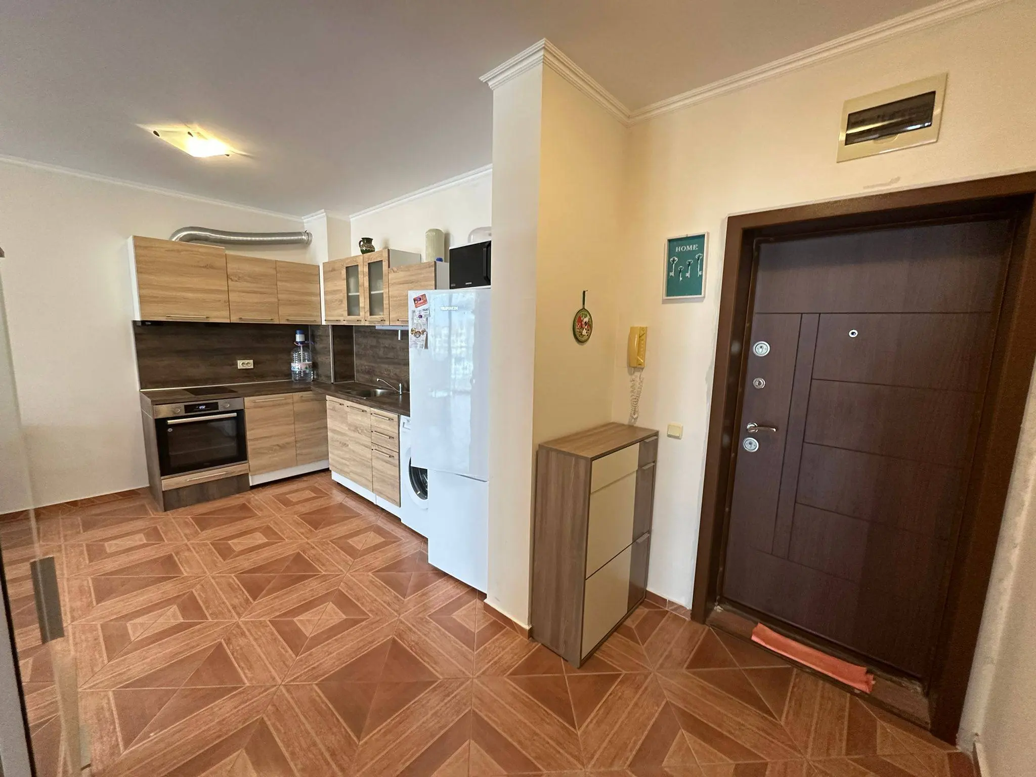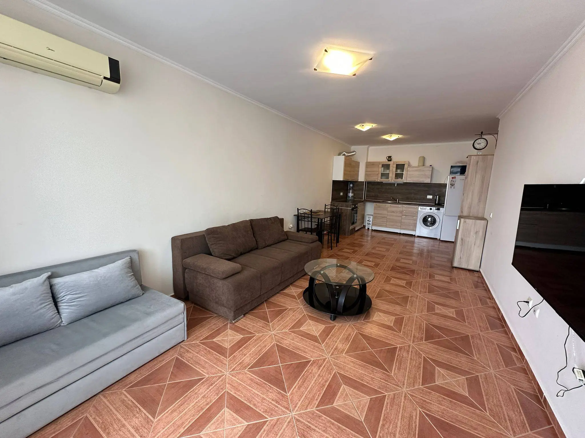 Двухкомнатная квартира в комплексе Sun Wave — это просторный апартамент площадью 92 м², расположенный на 5 этаже, предлагается по цене €131 000 с годовой таксой поддержки €9,60/м². Квартира имеет удобную планировку: светлая гостиная с кухонной зоной, отдельная спальня, ванная комната и терраса с западной ориентацией и видом на море. Апартамент полностью меблирован и оснащён техникой, подключён к бытовому тарифу электроэнергии и готов к проживанию или сдаче в аренду. Комплекс имеет Акт 16 и расположен всего в 50 метрах от моря, что делает его особенно привлекательным для жизни и отдыха.