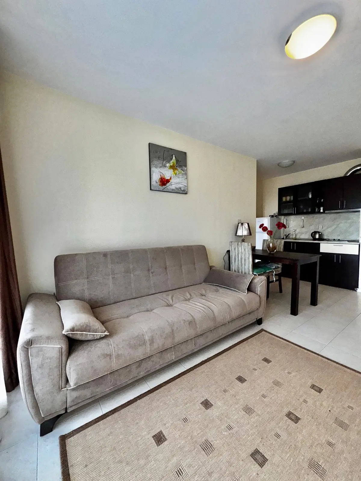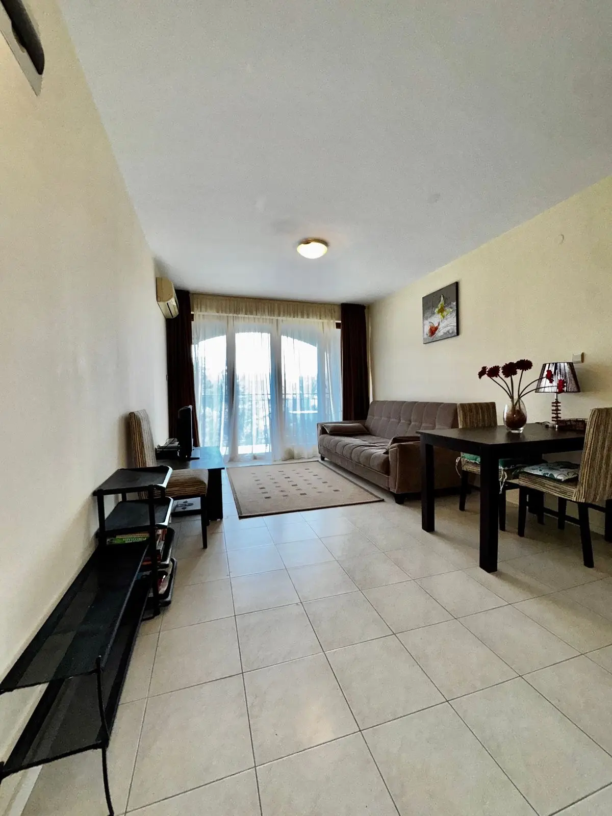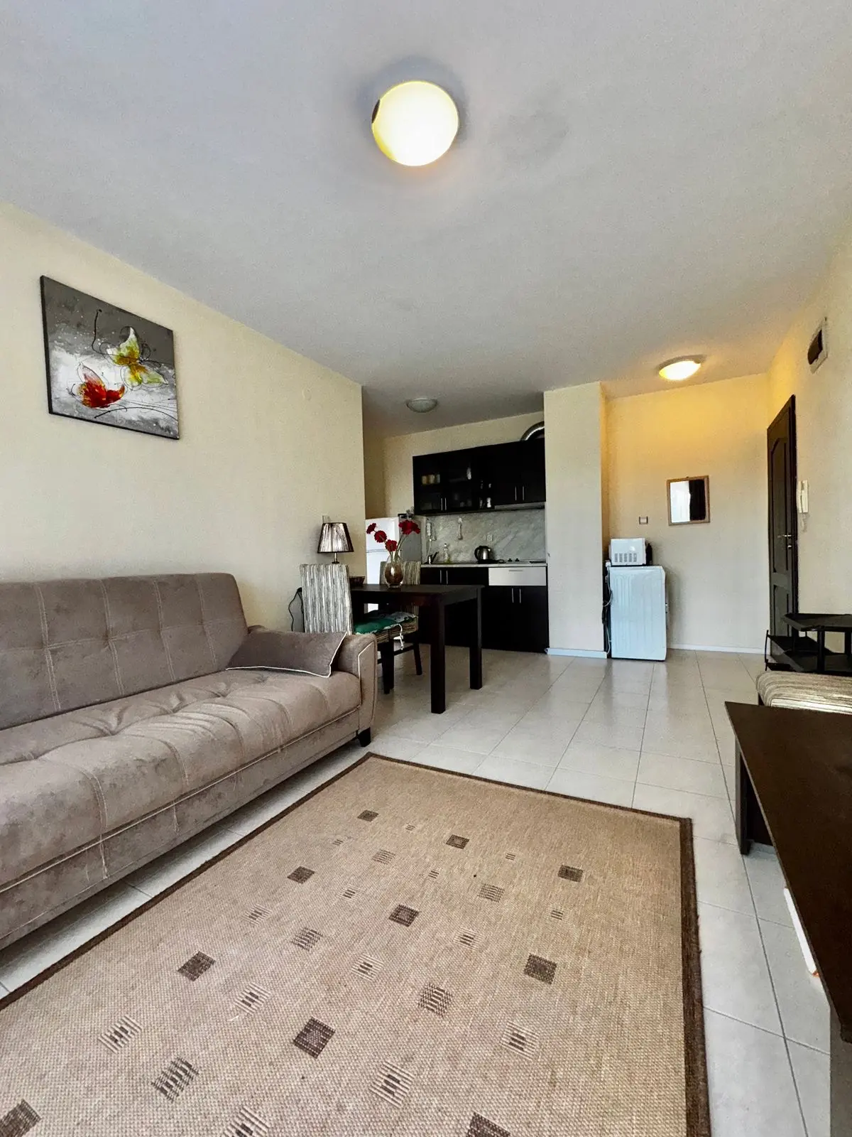 Апартамент включает светлую гостиную с кухонной зоной, отдельную спальню, ванную комнату и балкон. Планировка удобна как для отдыха, так и для круглогодичного проживания. Квартира находится в отличном состоянии и подходит для личного пользования или сдачи в аренду.