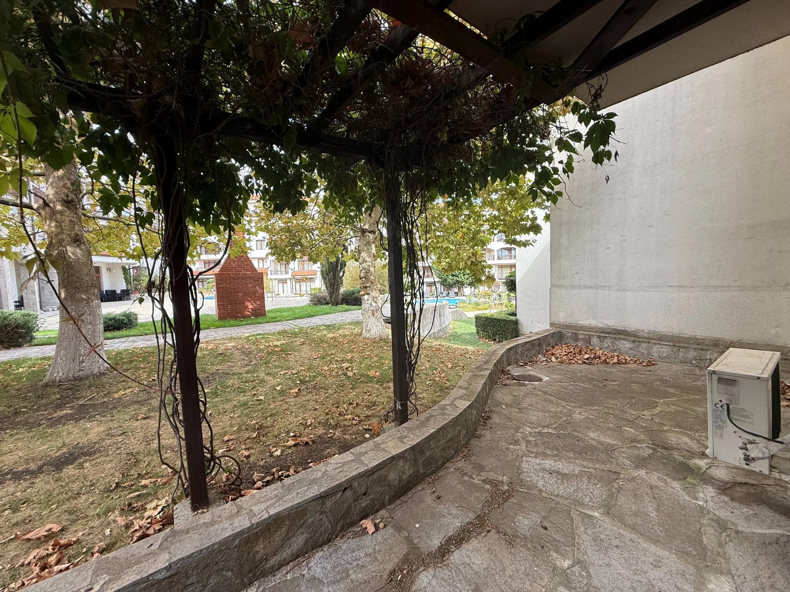 Предлагается уютная двухкомнатная квартира на первом (партерном) этаже в престижном комплексе Vineyards Resort, расположенном возле Ахелоя. Общая площадь апартамента — 58 м², с видом на ухоженный внутренний двор. Комплекс введён в эксплуатацию, есть Акт 16. До моря — около 2 км. Годовая такса поддержки — 12 €/м².