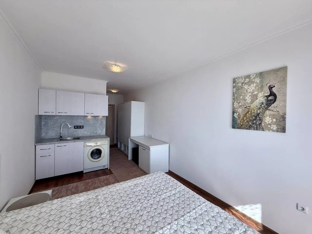 Предлагается стильная квартира-студия в закрытом комплексе Macon Residence, расположенном в курортном городе Святой Влас. Апартамент находится на 3 этаже здания с лифтом, общая площадь составляет 32 м². Из квартиры и просторной террасы открывается панорамный вид на море. Такса поддержки — 12 €/м² в год. Здание введено в эксплуатацию, есть Акт 16.