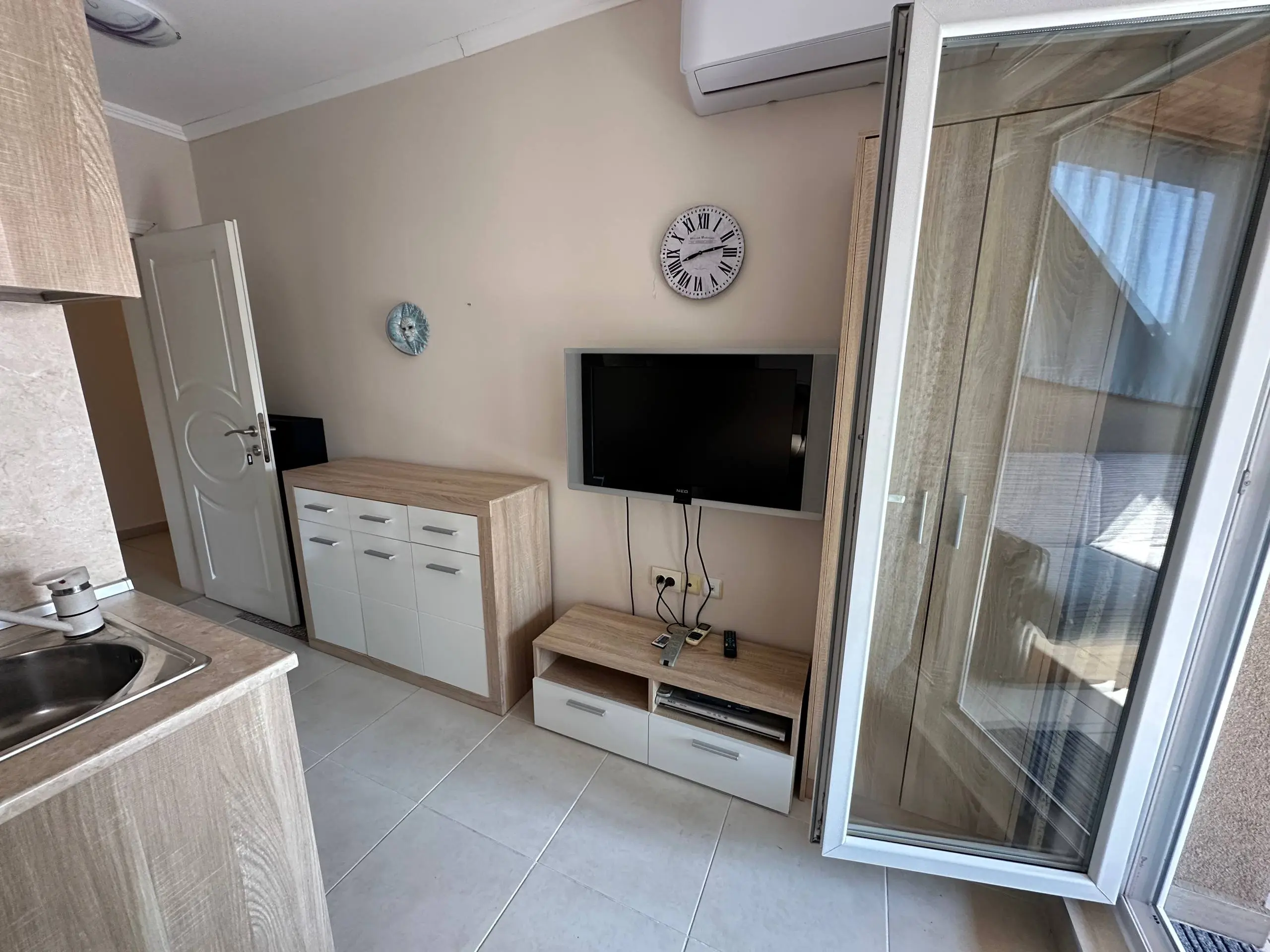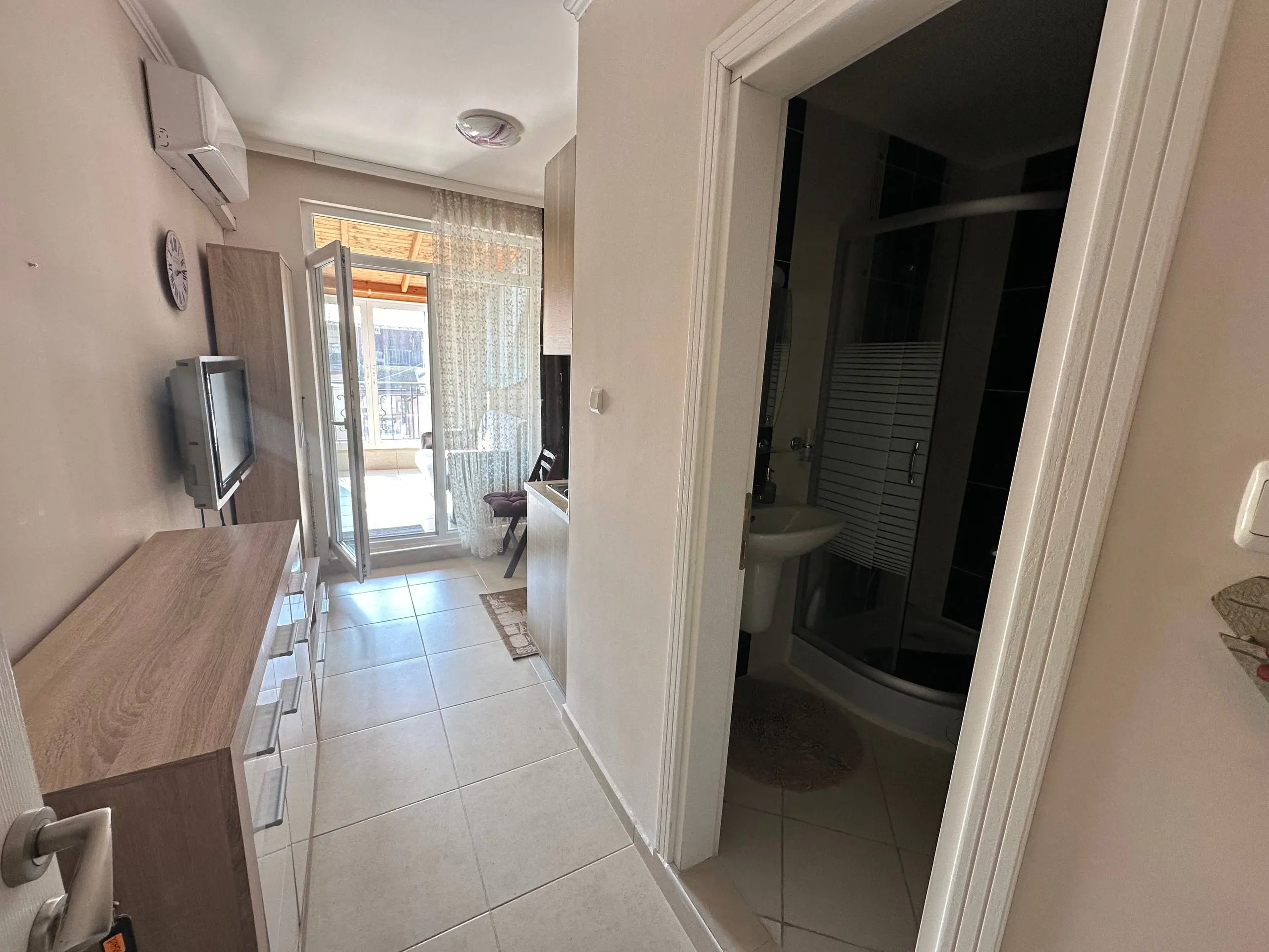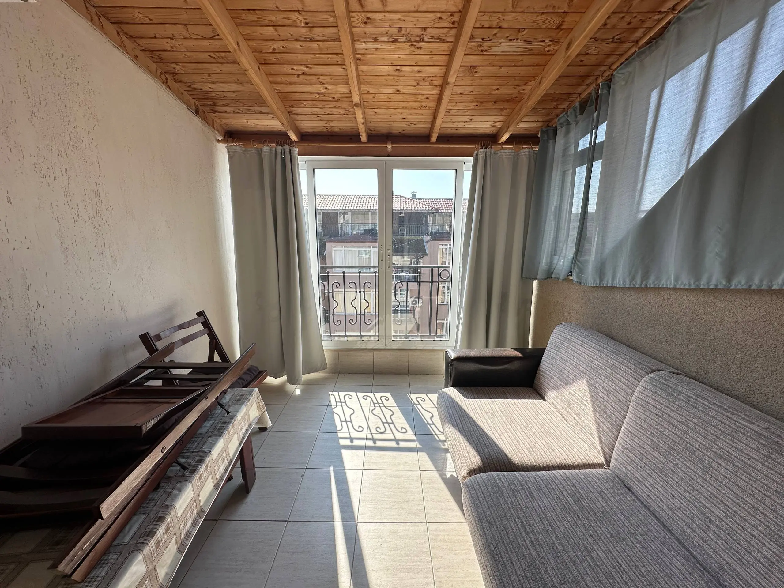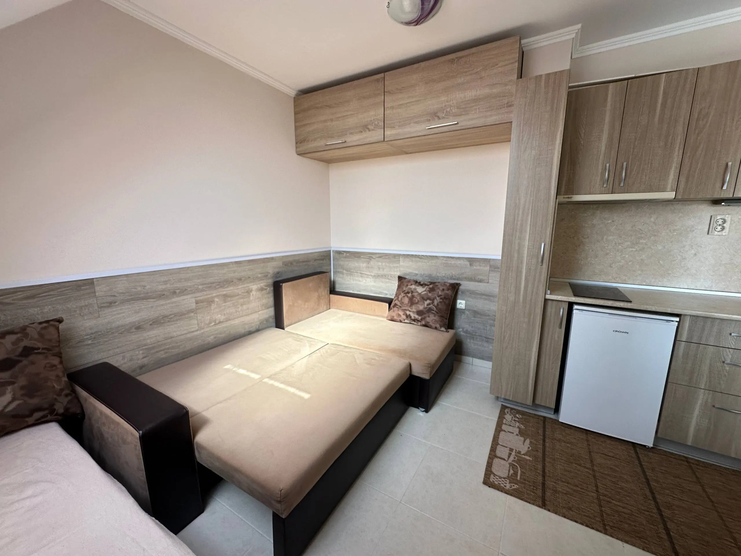 Предлагается к продаже уютная студия в современном жилом комплексе Persani 3 на курорте Солнечный Берег. Апартамент расположен на 6 этаже здания с лифтом, общая площадь составляет 36 м². Квартира имеет южную ориентацию, благодаря чему в помещении много естественного света. Планировка включает прихожую, гостиную с кухонной зоной и местом для отдыха, ванную комнату и террасу с видом на соседние здания. Студия полностью меблирована, оснащена бытовой техникой и кондиционером, что позволяет сразу использовать ее для проживания или аренды. Здание введено в эксплуатацию (Акт 16) и расположено примерно в 400 метрах от моря. Стоимость квартиры составляет 52 000 €, ежегодная такса поддержки — 10 €/м². Апартамент подходит как для отдыха у моря, так и для круглогодичного проживания или инвестиций.