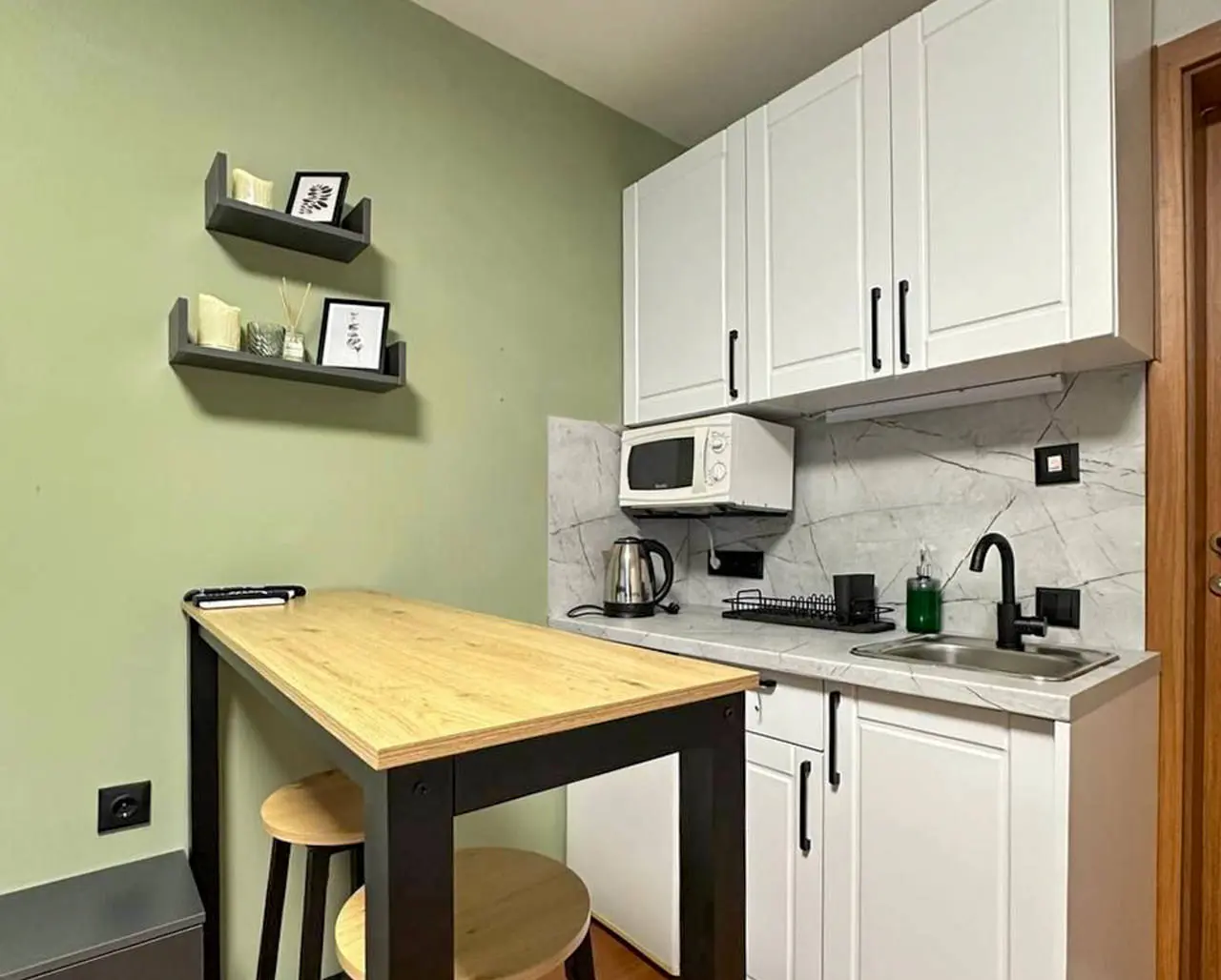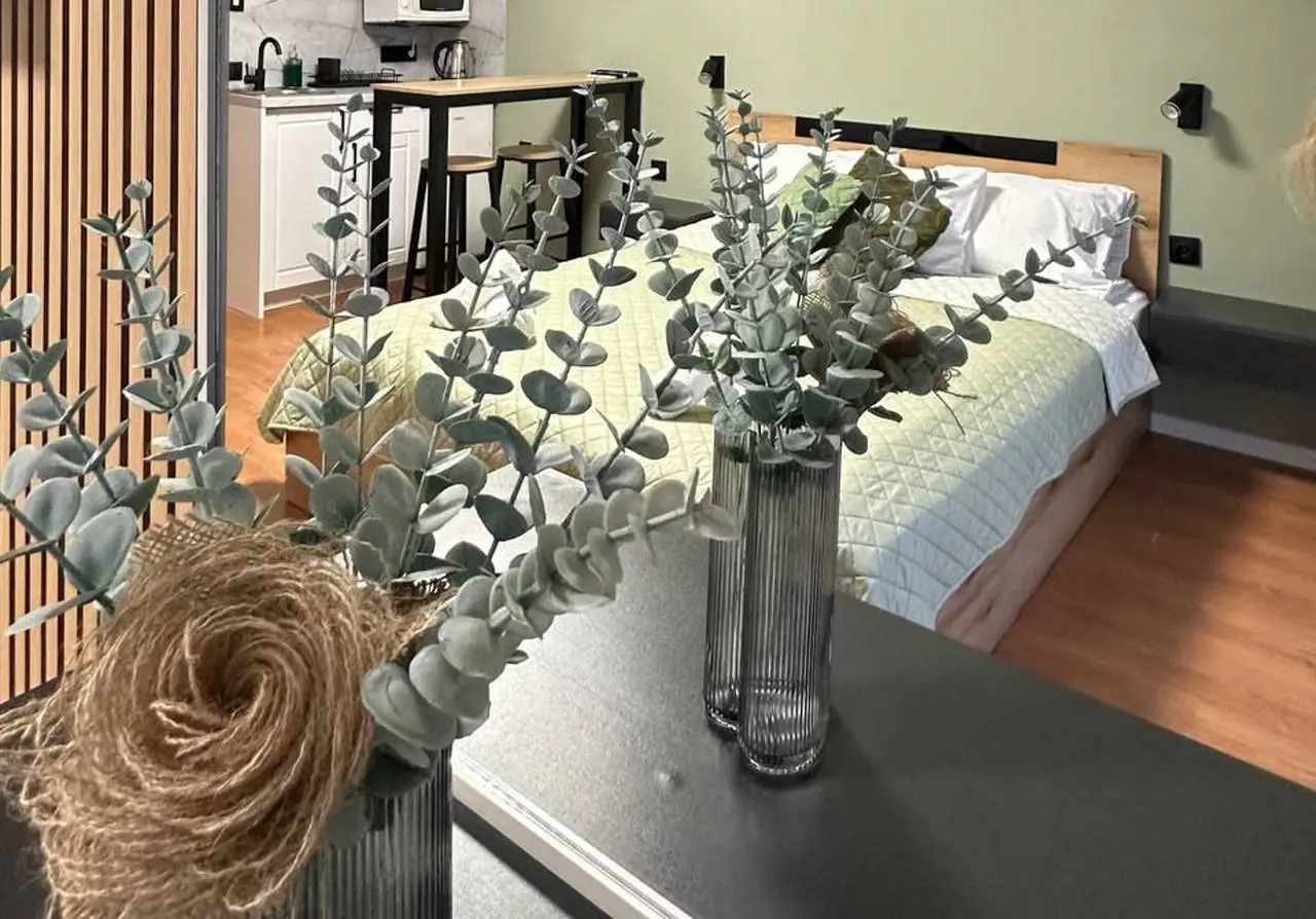 Интерьер выполнен в спокойных натуральных тонах с продуманным зонированием: кухонная зона аккуратно отделена от зоны отдыха. Квартира укомплектована качественной мебелью и техникой, ванная комната полностью оборудована. Терраса утопает в зелени и создаёт атмосферу уединения — идеальное место для отдыха у моря.