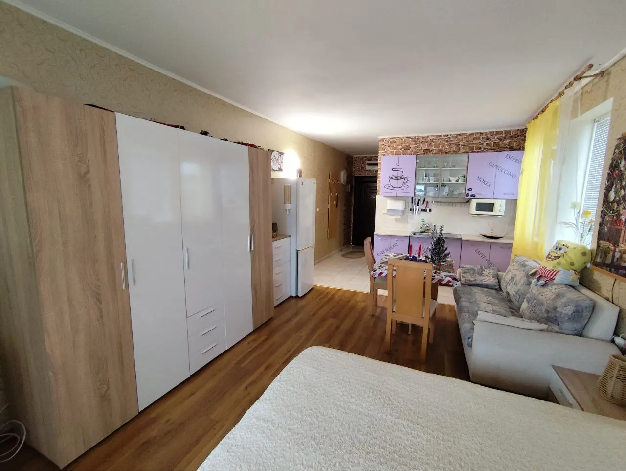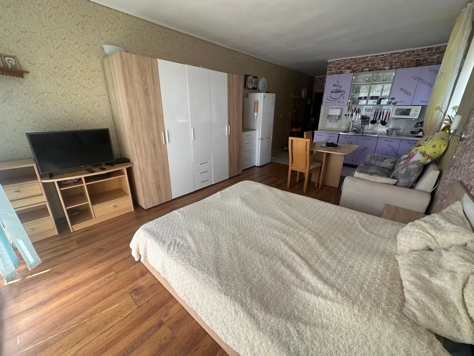 Студия светлая и просторная, с удобной планировкой: прихожая, оборудованная кухонная зона с обеденным столом, зона отдыха и сна, ванная комната и терраса. Апартамент полностью готов к проживанию или сдаче в аренду и не требует дополнительных вложений.