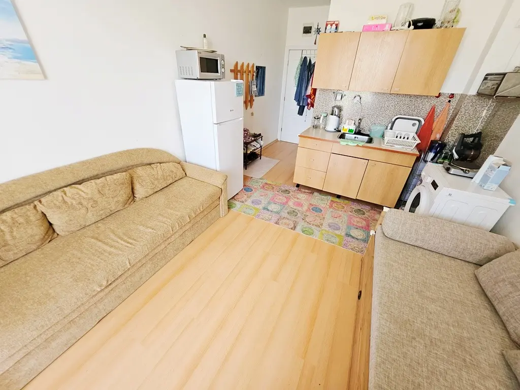 Предлагается к продаже уютная студия в жилом комплексе Sunny Day 5, расположенном в спокойной части курорта Солнечный Берег. Апартамент находится на 2 этаже и имеет общую площадь 31 м². Планировка включает жилую зону с кухонным уголком, спальное пространство, ванную комнату с туалетом и террасу. Квартира продается с мебелью и бытовой техникой, полностью готова к проживанию или сдаче в аренду. Стоимость объекта составляет 32 500 €. Комплекс расположен примерно в 4 км от песчаных пляжей курорта. Ежегодная такса обслуживания — 580 €.