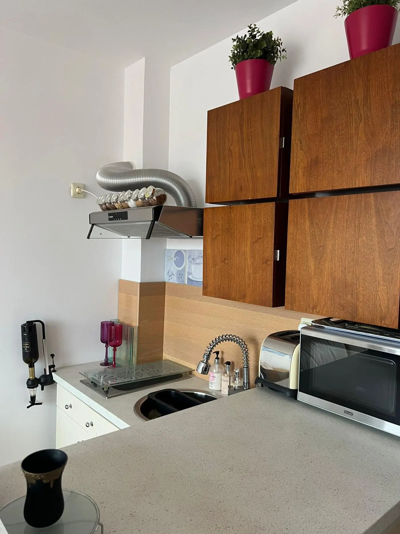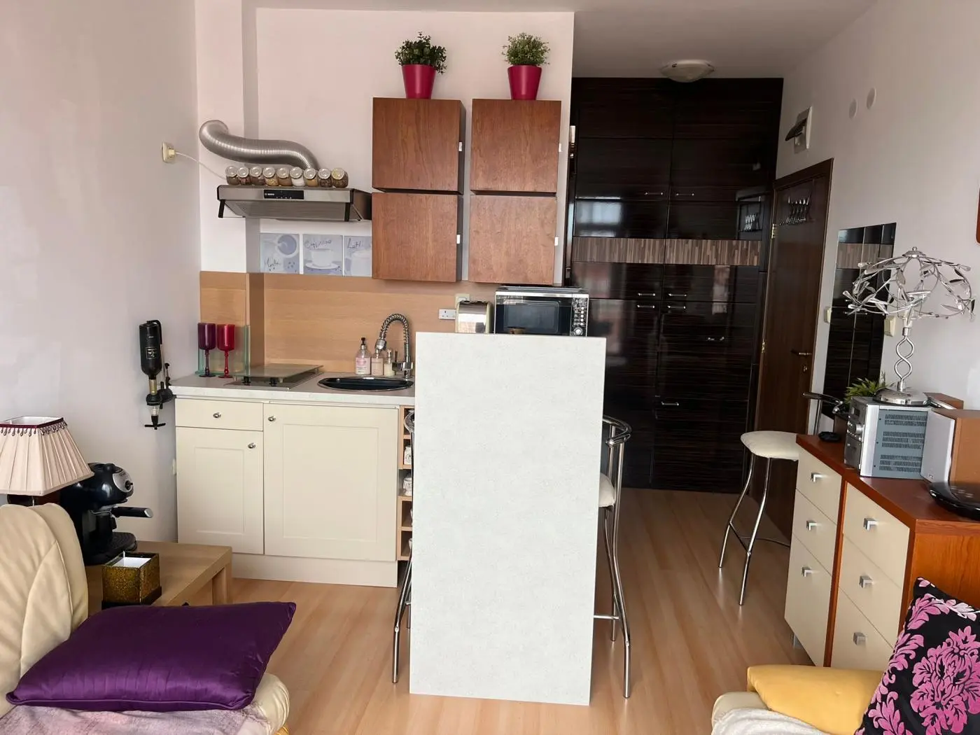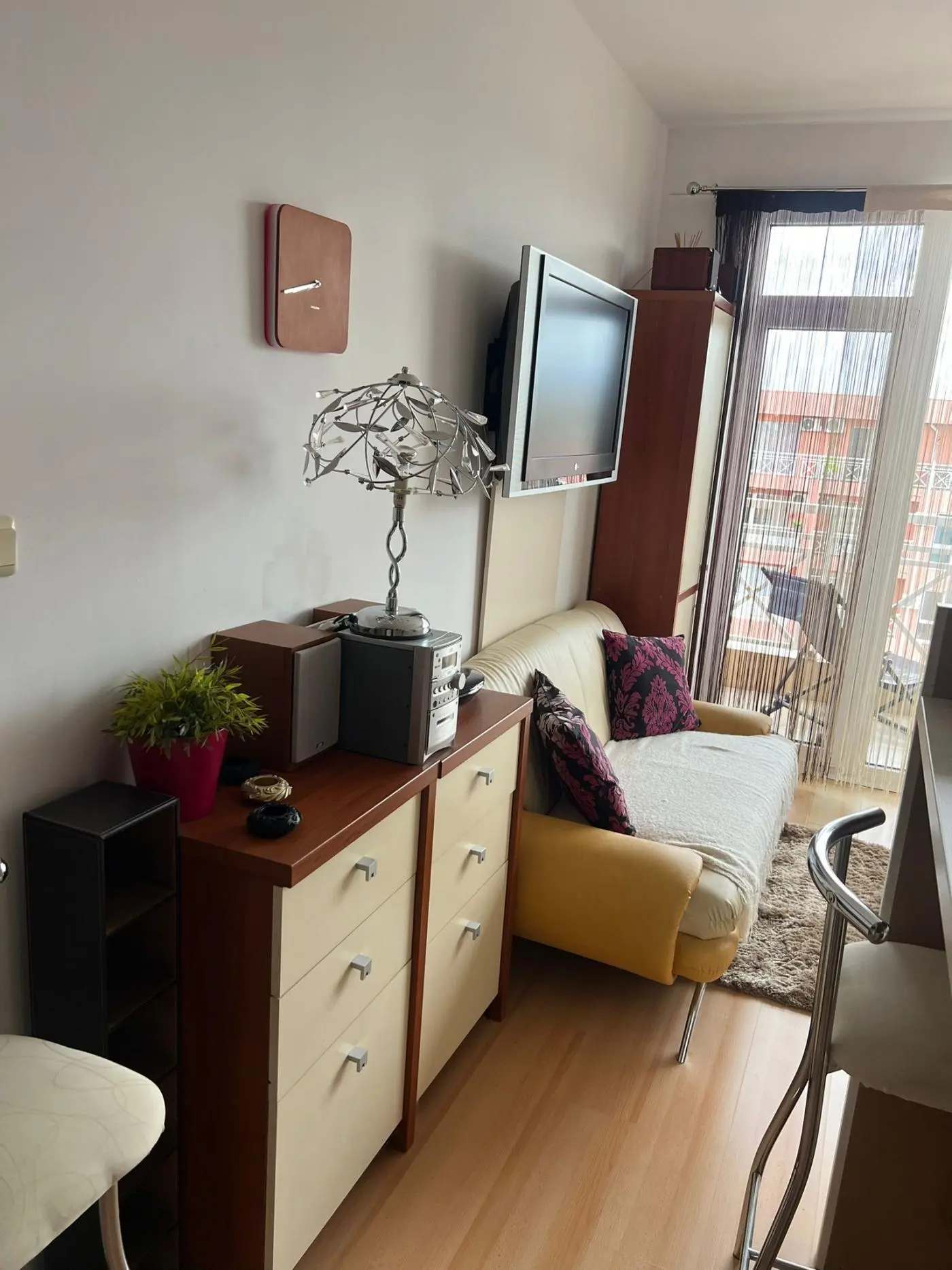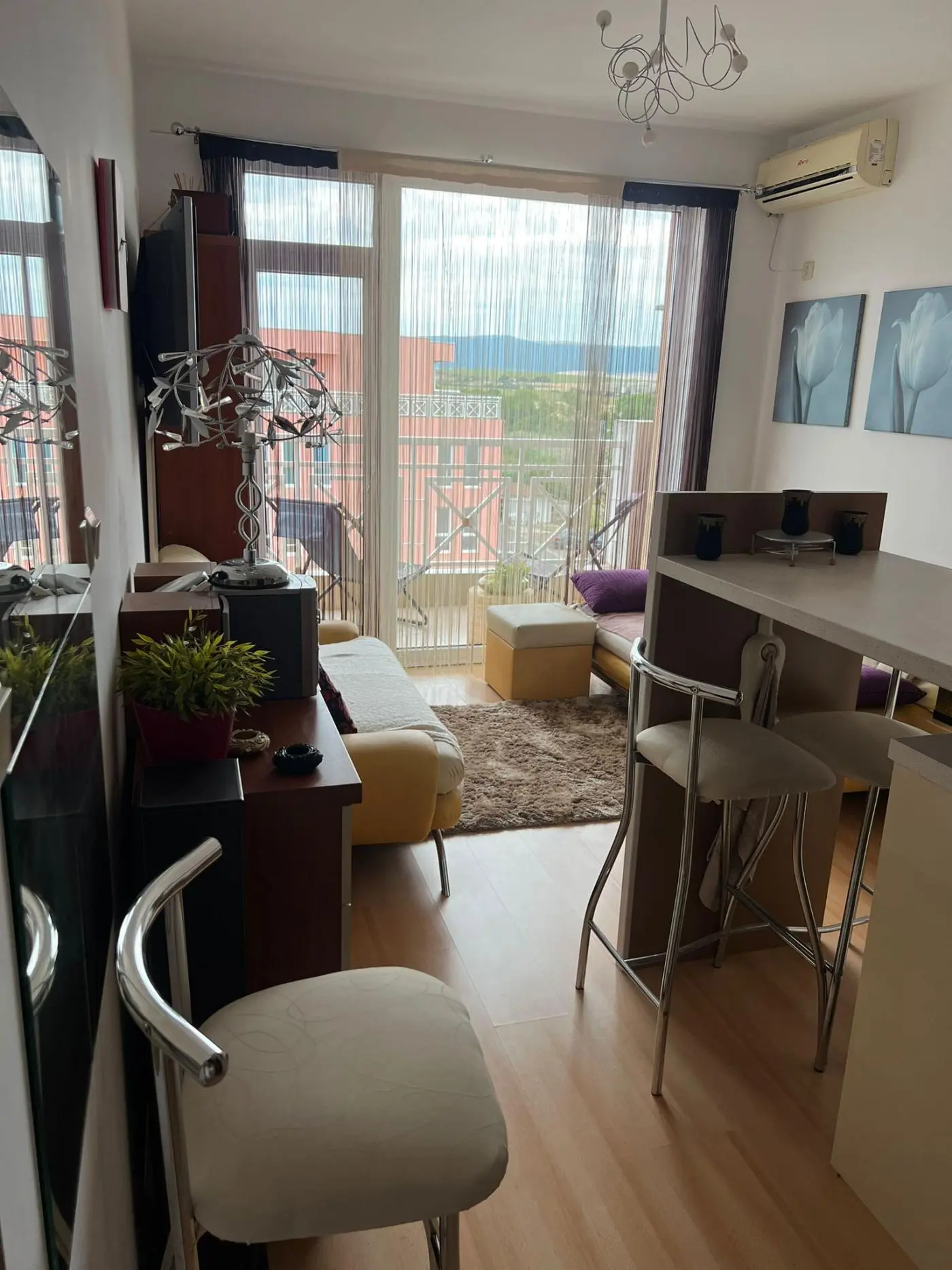 Предлагается к продаже светлая студия в комплексе Sunny Day 6 на курорте Солнечный Берег. Апартамент площадью 27 м² расположен на 4 этаже в здании без лифта и предлагается по цене 35 000 €. Годовая такса поддержки составляет 580 €. Квартира с Актом 16, полностью меблирована и оборудована техникой, готова к проживанию или сдаче в аренду. Удобная планировка включает прихожую, гостиную с кухонной зоной и местом для отдыха, ванную комнату и террасу. Благодаря солнечной ориентации и панорамным окнам в помещении много естественного света. До моря около 4 км, что обеспечивает спокойную атмосферу вдали от шума набережной.