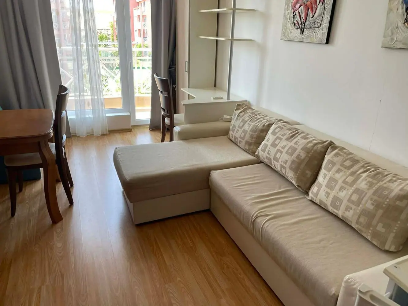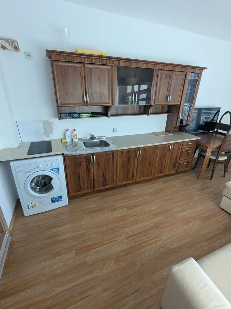 Планировка студии функциональная: общее пространство удобно разделено на зону отдыха, кухонный уголок и место для сна. Есть ванная комната с туалетом и балкон, который отлично подходит для отдыха на свежем воздухе. Квартира подходит как для личного использования, так и в качестве инвестиции с возможностью сезонной аренды.