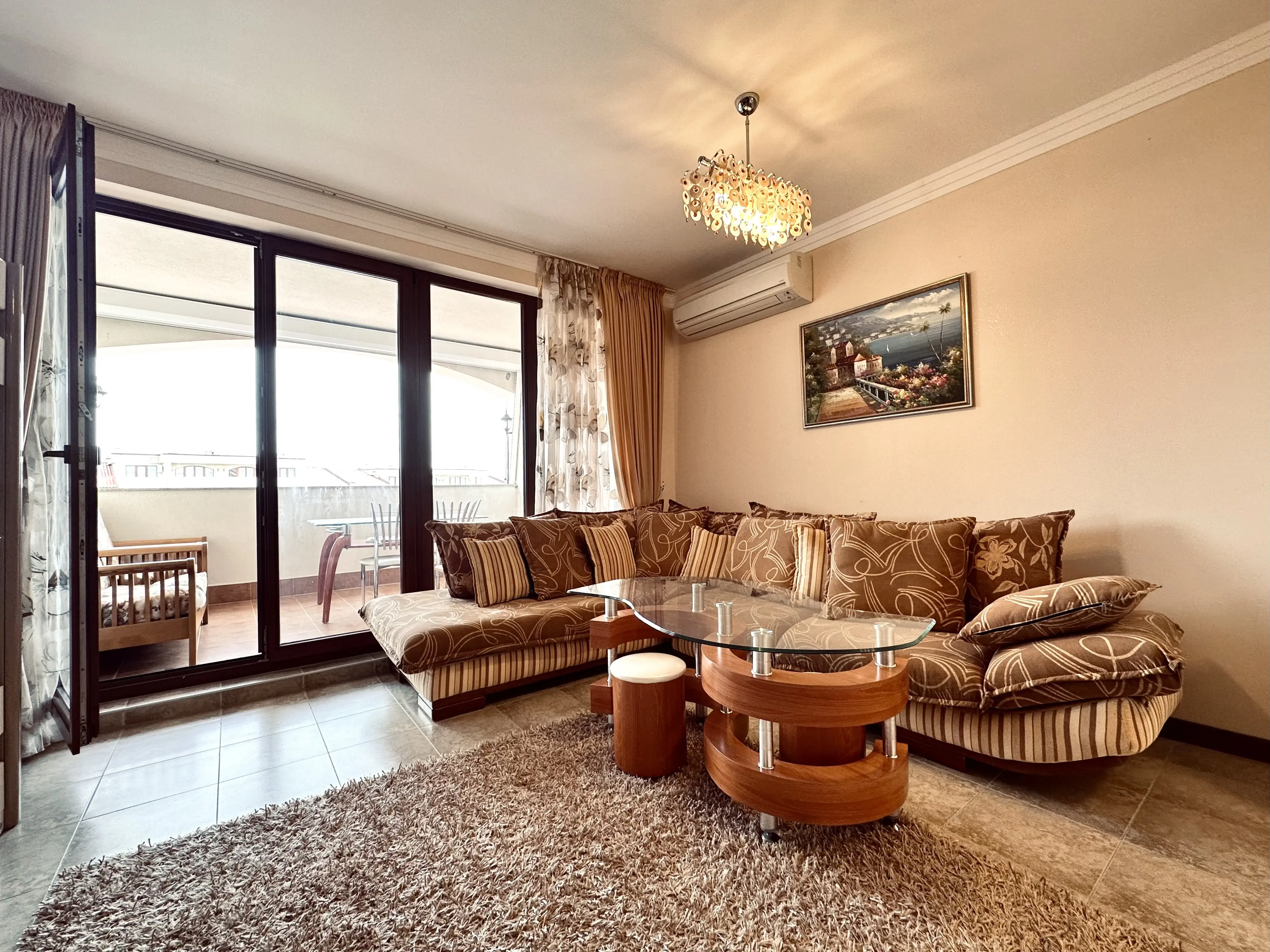 Просторная трёхкомнатная квартира общей площадью 116,76 м² расположена на 4 этаже здания с лифтом. Планировка включает: светлую гостиную с кухонной зоной и столовой, 2 спальни, ванную комнату и 2 террасы с великолепным видом на море и бассейн. Квартира полностью меблирована и оснащена современной техникой. Отделка выполнена с использованием качественных материалов, интерьер оформлен в светлых, тёплых тонах. Из больших панорамных окон открывается прямой вид на море. Здание имеет Акт 16. Расстояние до пляжа — всего 30 метров. Такса обслуживания: 12 €/м² в год (до 2026 г.), с 2026 г. — 14 €/м² в год.
