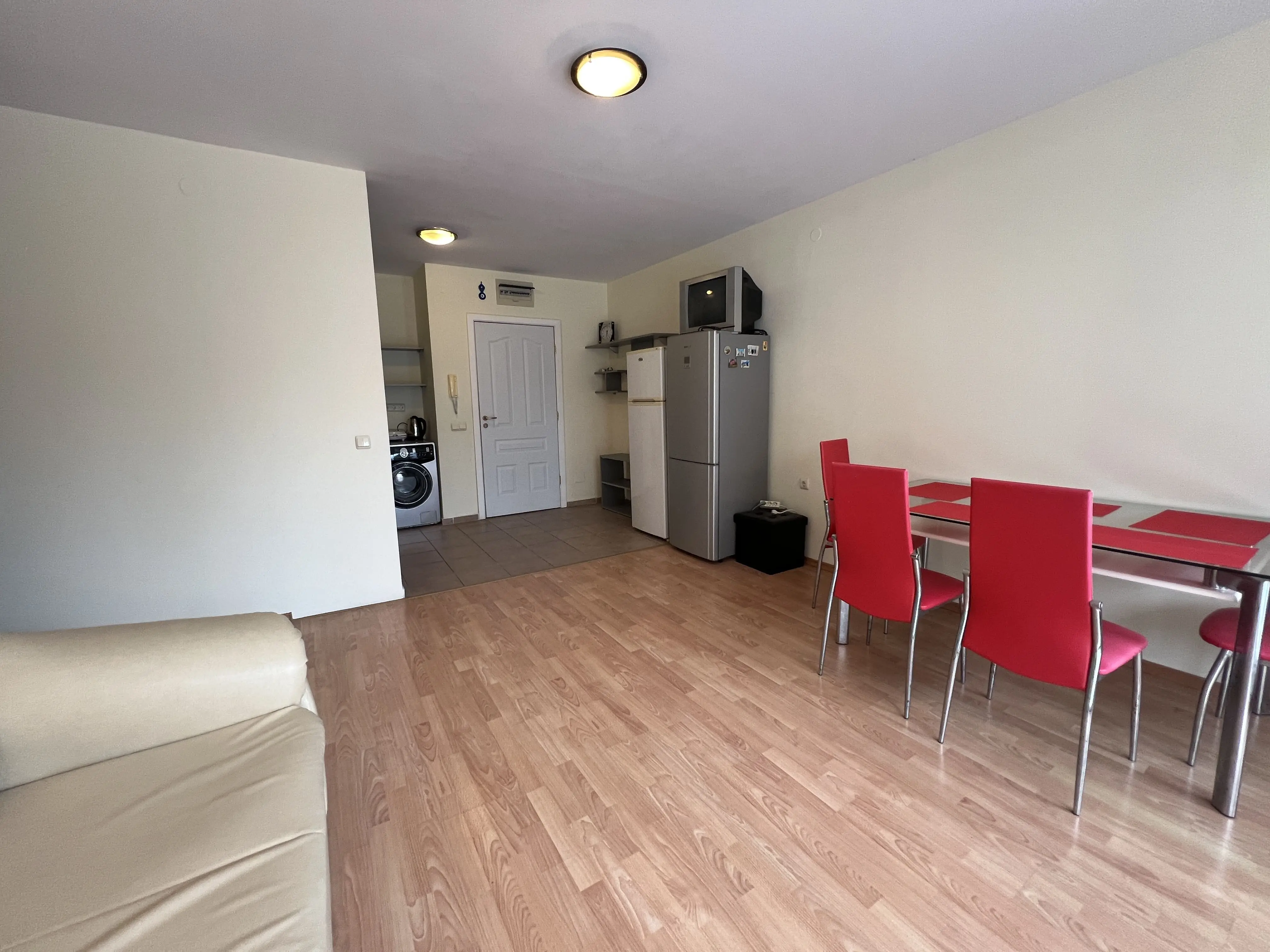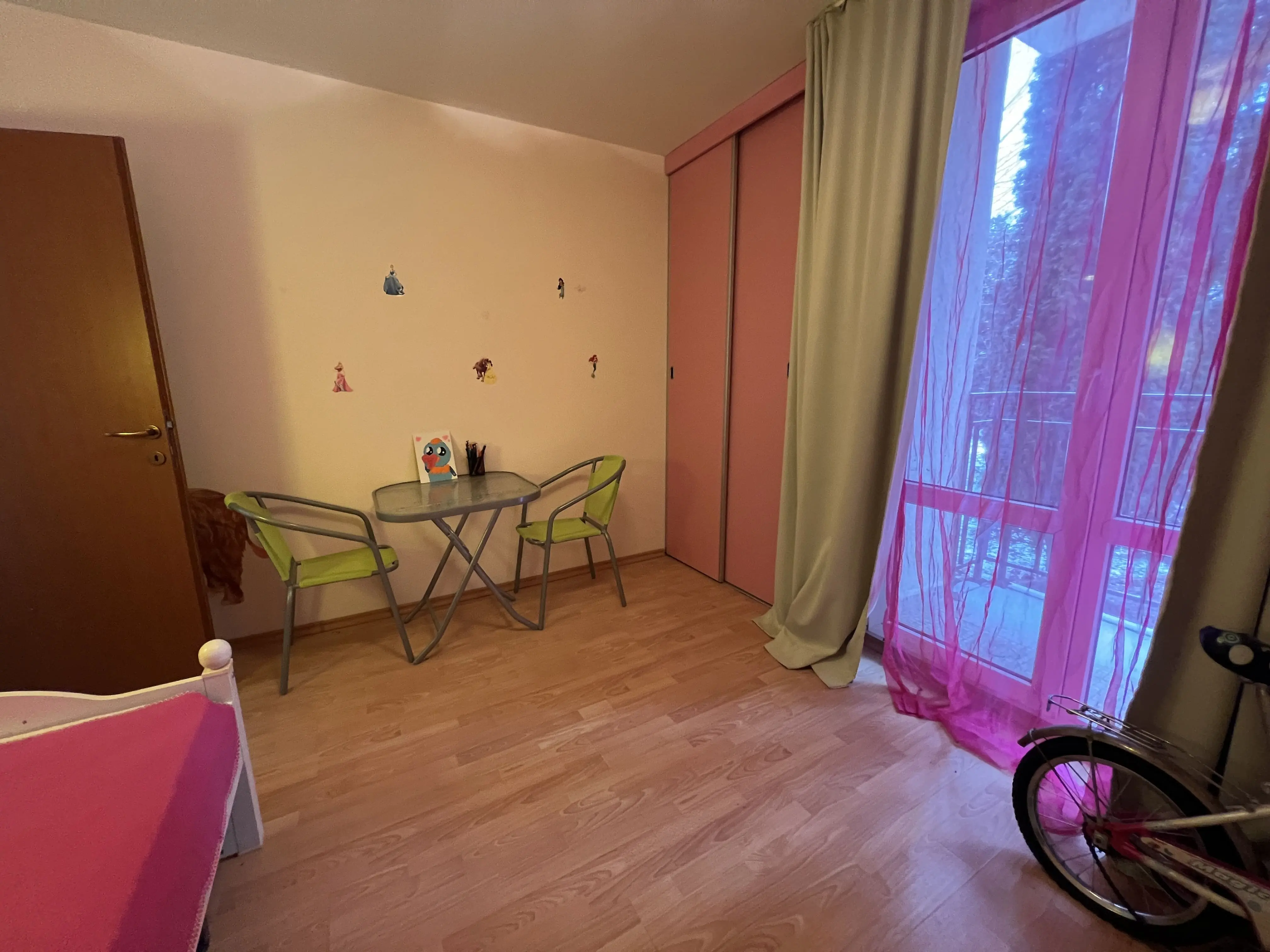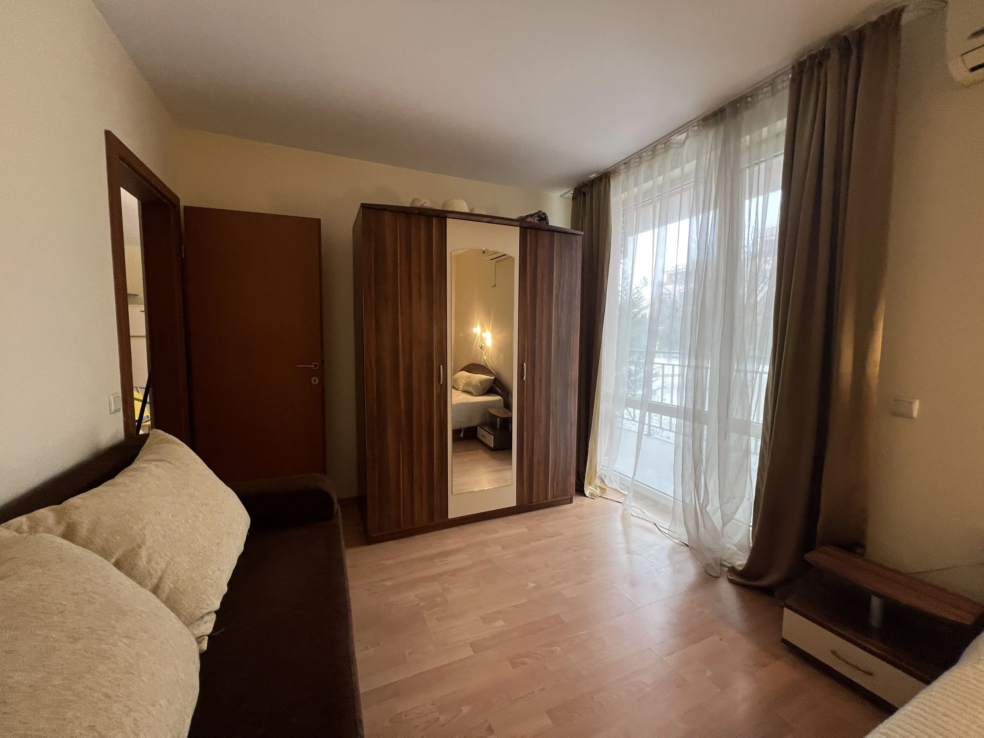Трёхкомнатная квартира общей площадью 90 м² расположена на 1 этаже комплекса Holiday Fort Club на курорте Солнечный Берег и предлагается по цене 81 900 €. Объект с Актом 16 и таксой поддержки 13,50 € за м² в год полностью меблирован и готов к проживанию или сдаче в аренду. Из окон и с двух террас открывается вид на бассейн и ухоженную территорию комплекса, а дорога до моря занимает около 800 м. Планировка с двумя спальнями и просторной гостиной с кухонной зоной делает квартиру удобной для семейного отдыха и долгосрочного проживания.