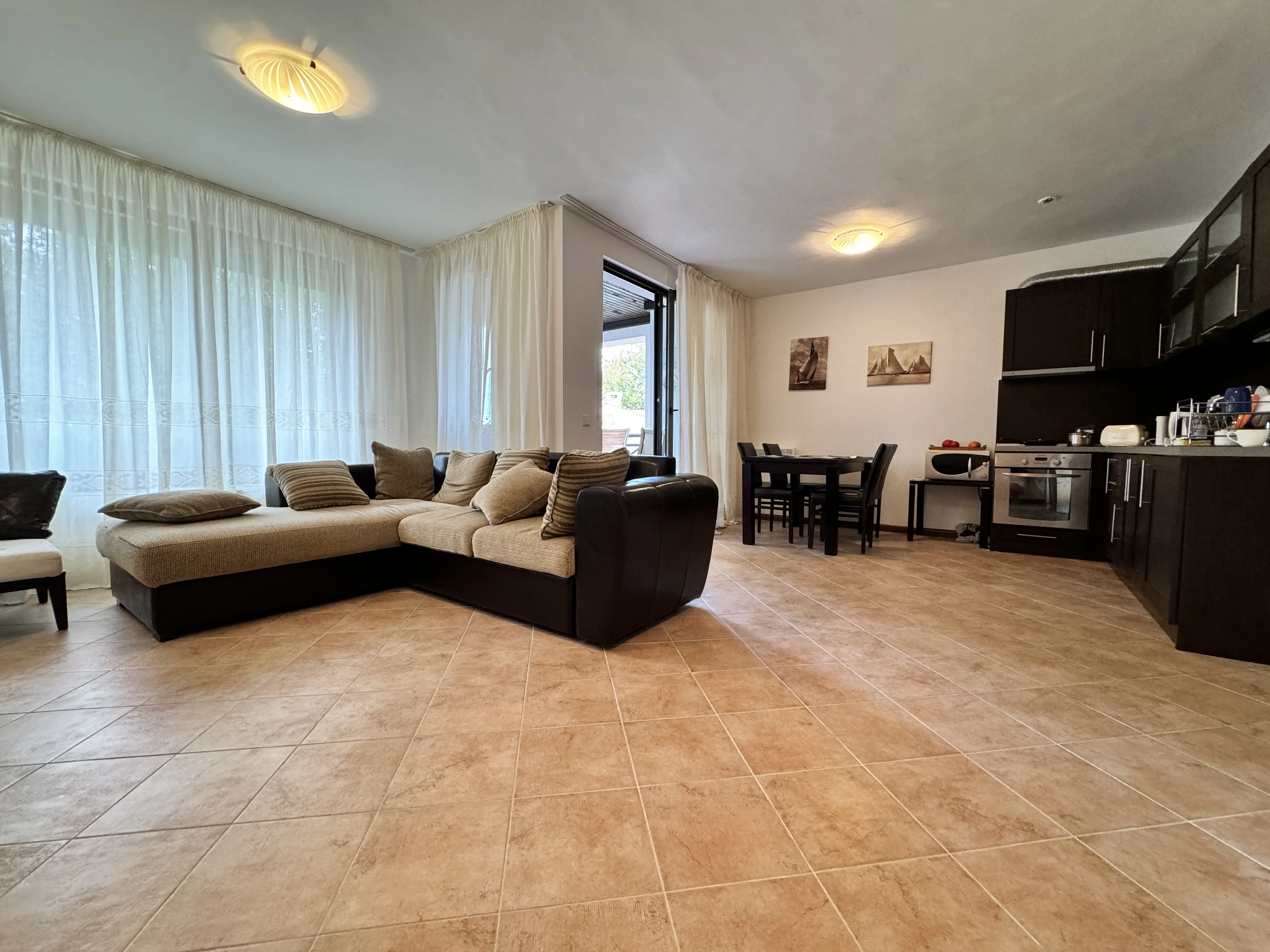 Квартира имеет удобную и рациональную планировку: прихожая, просторная гостиная с открытой кухонной зоной, две отдельные спальни и две террасы — одна с видом на море. В каждой спальне предусмотрен собственный санузел, кроме того имеется гостевой санузел и практичная кладовая. Во всех жилых помещениях установлены радиаторы отопления, что делает апартамент пригодным для комфортного круглогодичного проживания. Жильё полностью готово к въезду или для непосредственной эксплуатации в посуточной аренде.