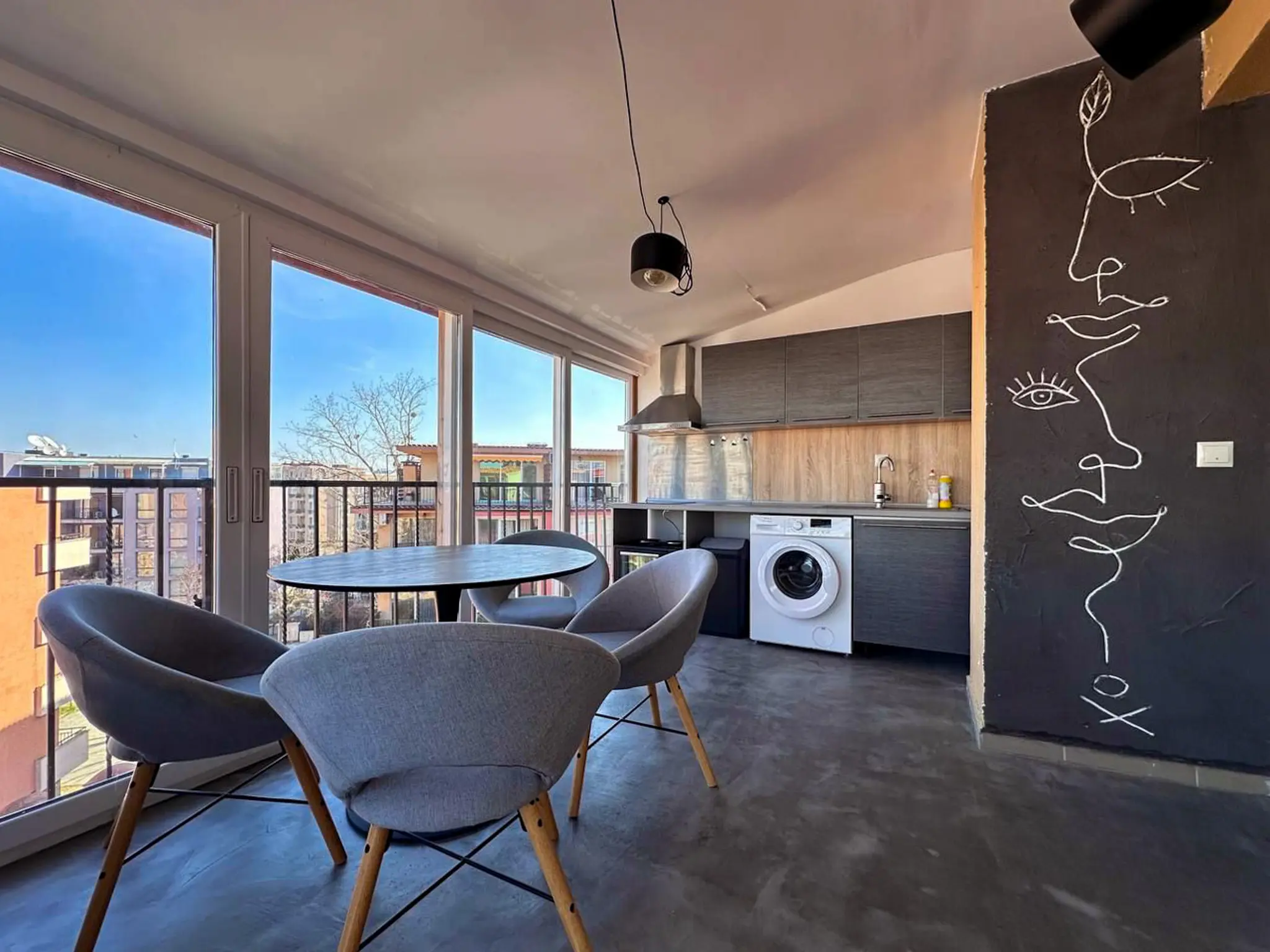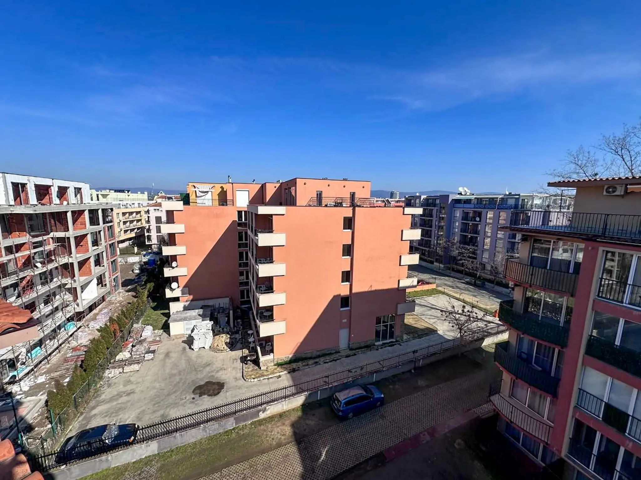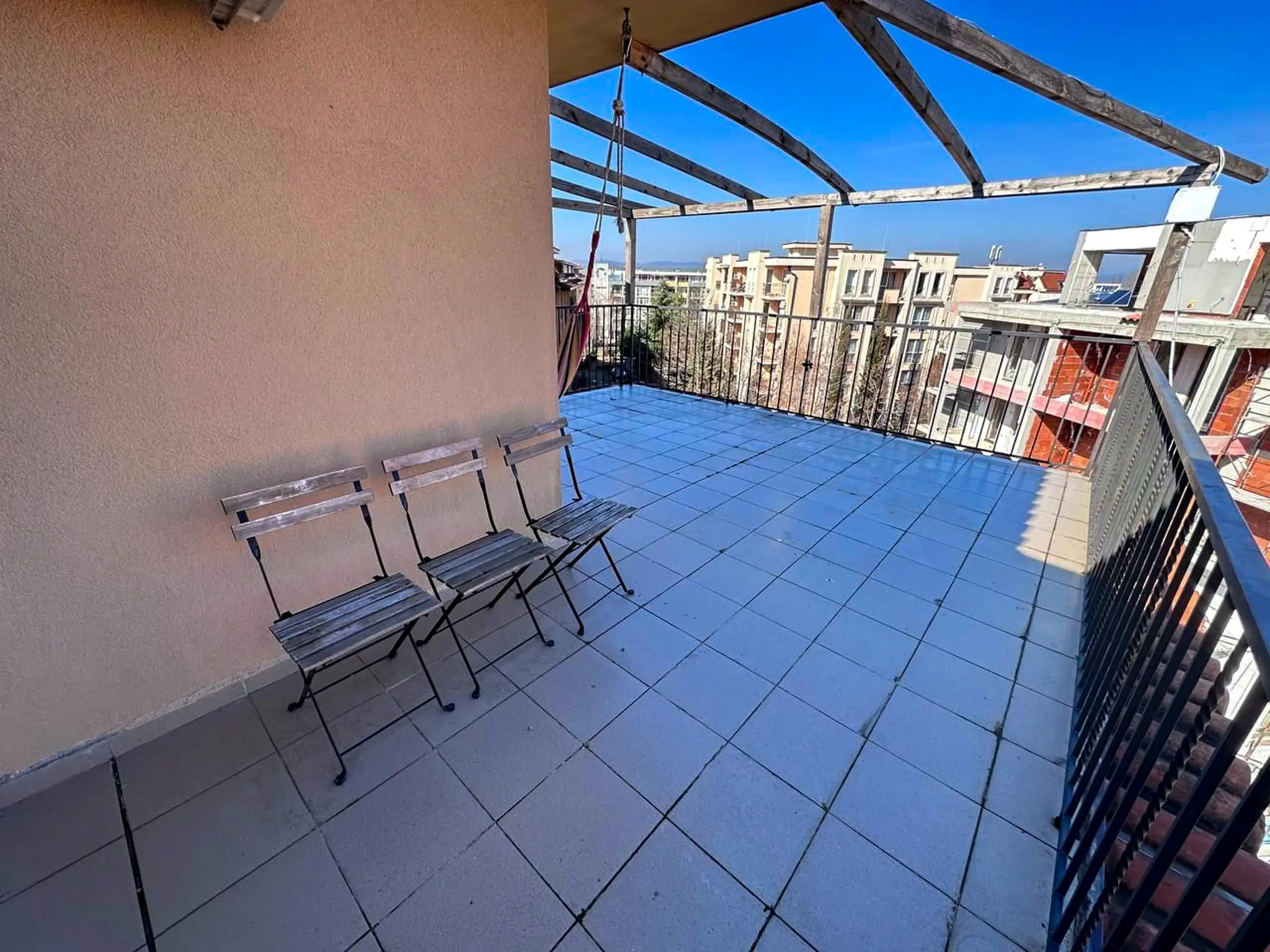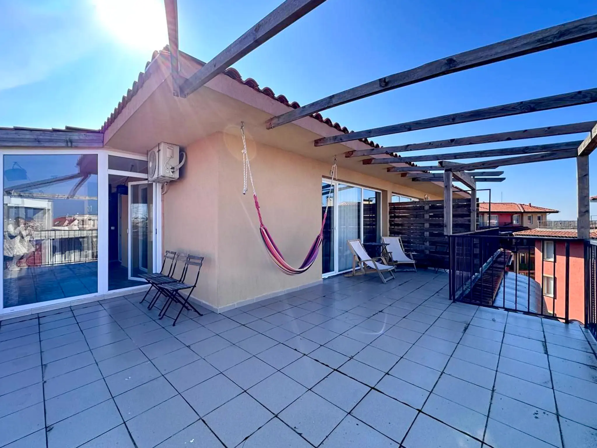 Квартира общей площадью 112 м² расположена на 5 этаже комплекса Sunny View Central и отличается удачной планировкой и большим количеством открытого пространства. Здесь две полноценные спальни, каждая со своей ванной комнатой, что особенно удобно для семьи или приема гостей. Светлая гостиная с кухней и обеденной зоной выходит на главную террасу — просторную, функциональную, с местом для шезлонгов, обеденного стола и даже барбекю. Апартамент полностью меблирован, оснащен техникой и кондиционерами — готов к проживанию или аренде без дополнительных вложений. До моря — всего 500 метров, такса поддержки — 1 344 € в год.