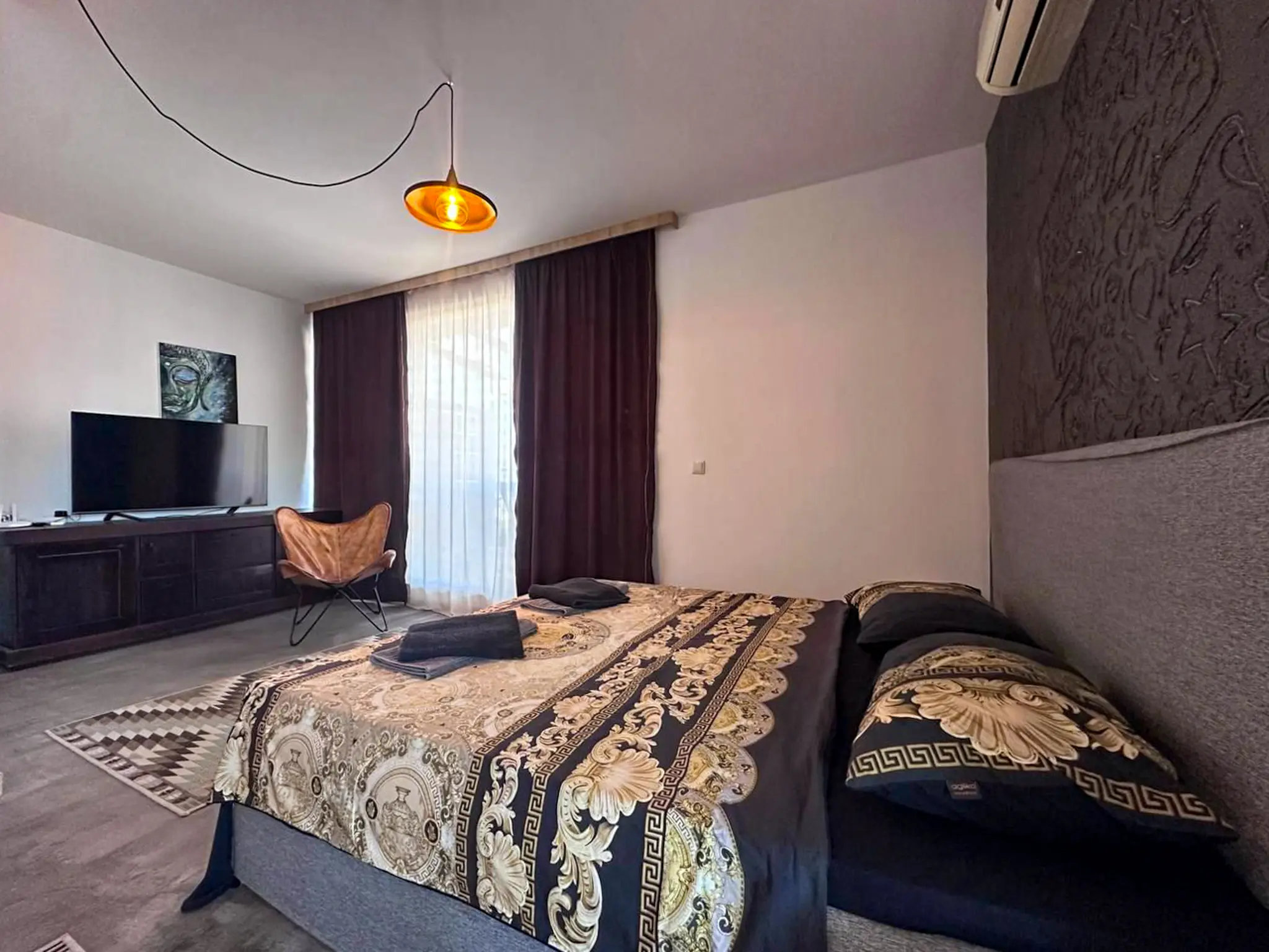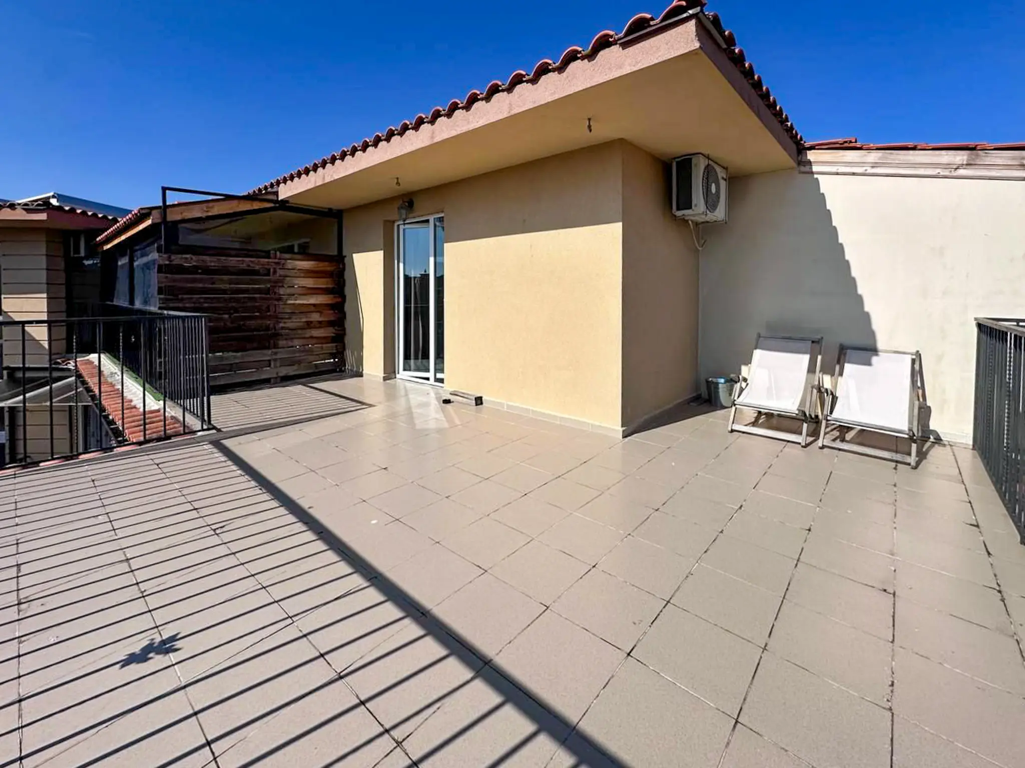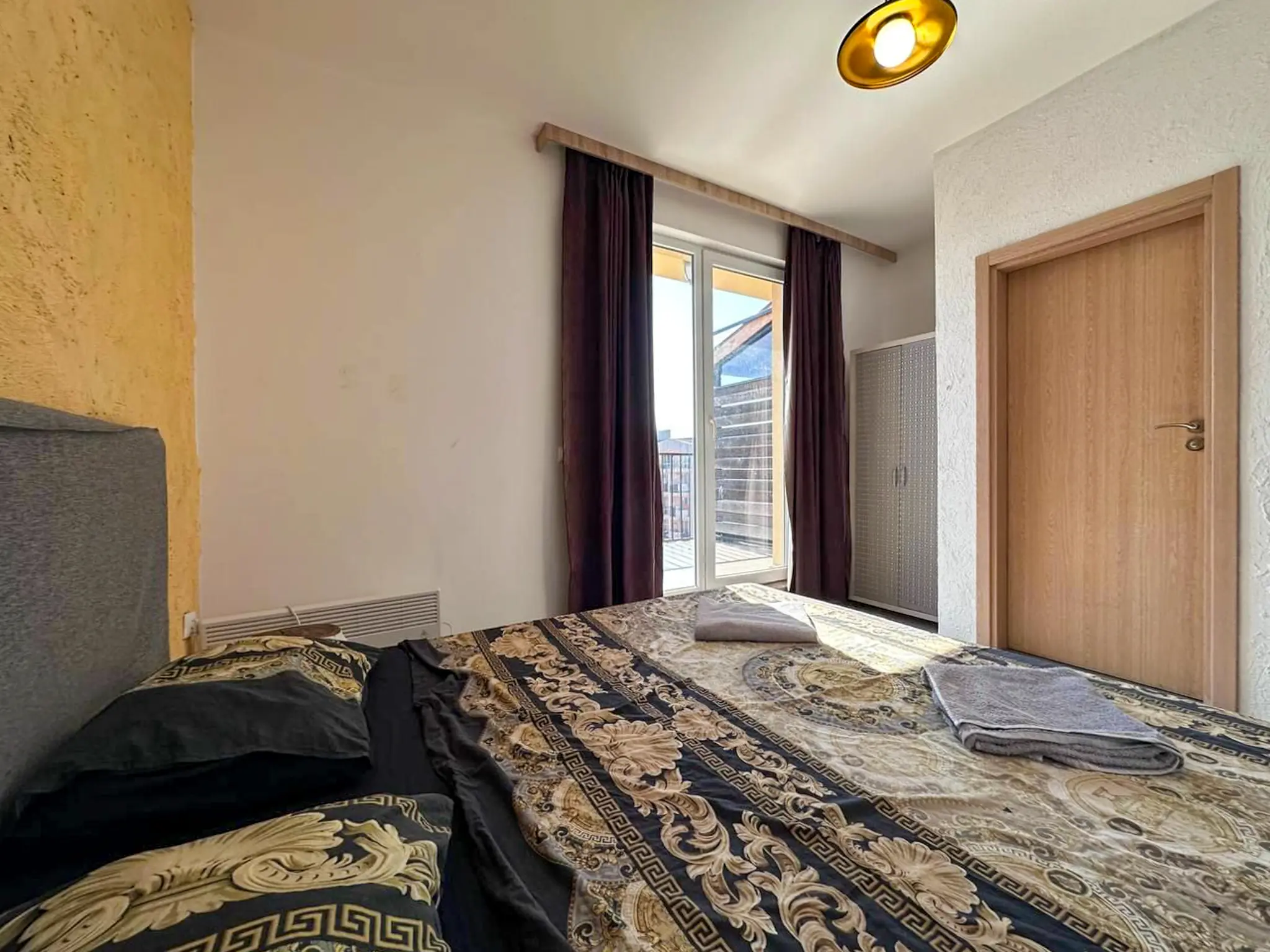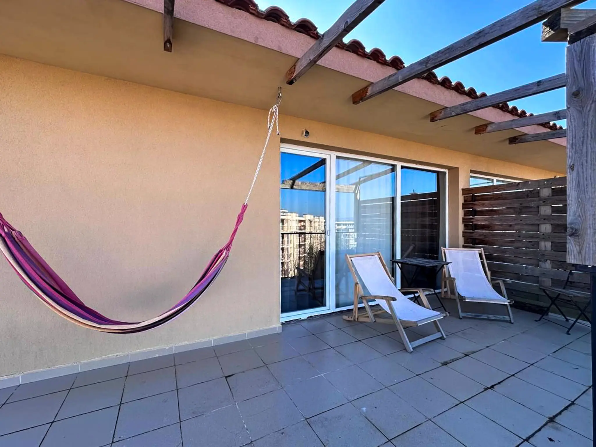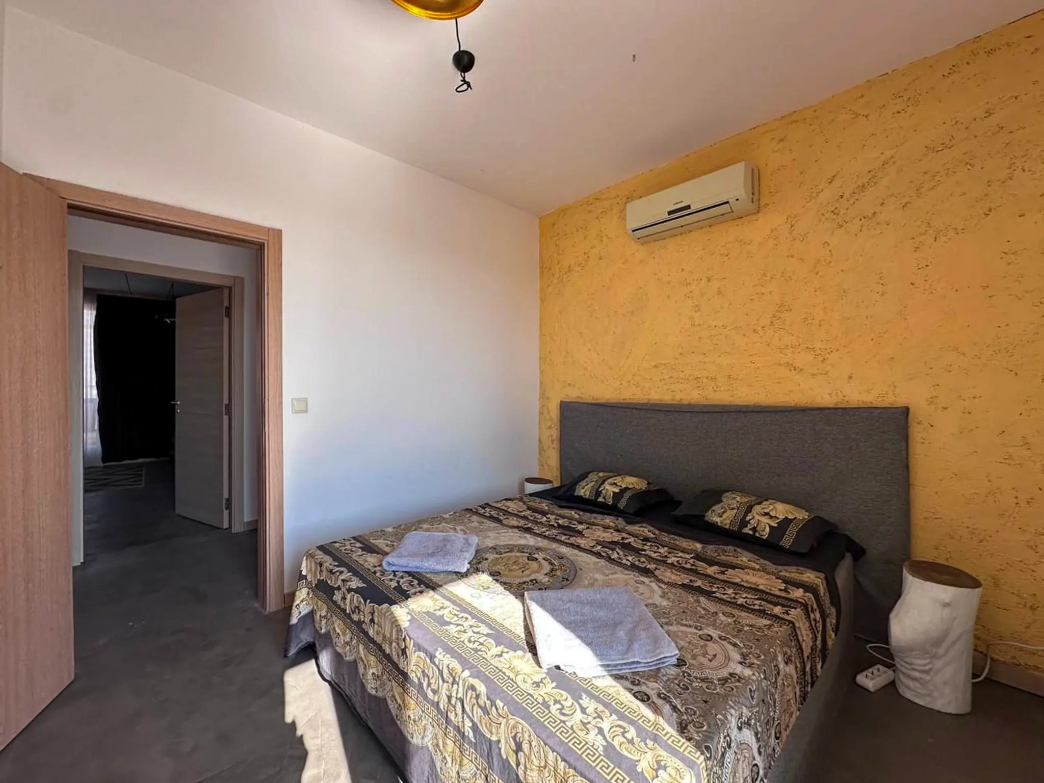 Квартира общей площадью 112 м² расположена на 5 этаже комплекса Sunny View Central и отличается удачной планировкой и большим количеством открытого пространства. Здесь две полноценные спальни, каждая со своей ванной комнатой, что особенно удобно для семьи или приема гостей. Светлая гостиная с кухней и обеденной зоной выходит на главную террасу — просторную, функциональную, с местом для шезлонгов, обеденного стола и даже барбекю. Апартамент полностью меблирован, оснащен техникой и кондиционерами — готов к проживанию или аренде без дополнительных вложений. До моря — всего 500 метров, такса поддержки — 1 344 € в год.